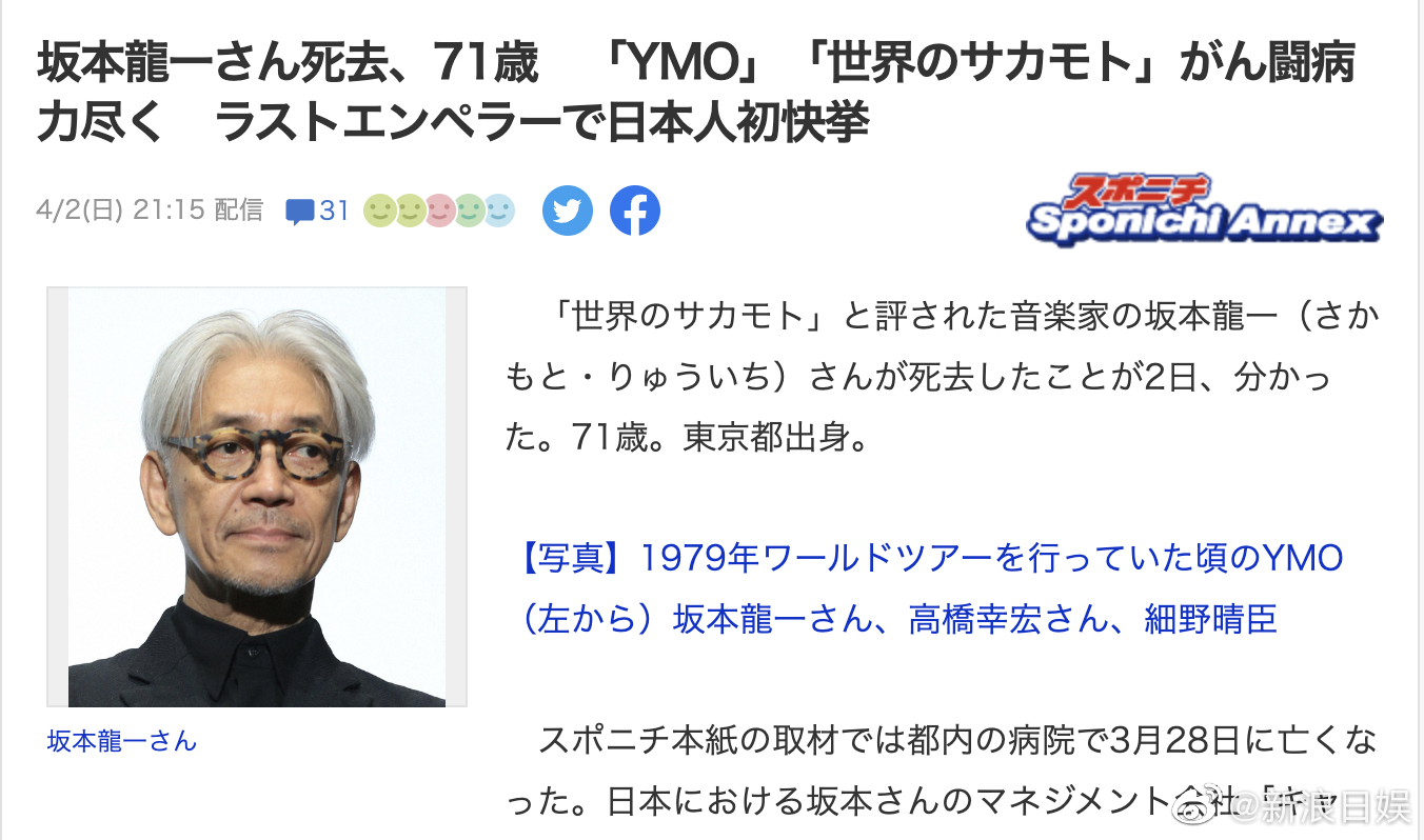 据日媒消息,音乐家坂本龙一3月28日在东京都病逝,享年71岁。