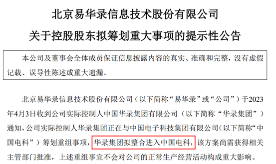 4月3日晚间,易华录发布公告称,公司收到实际控制人中国华录集团有限公司(简称“华录集团”)通知,华录集团正在与中国电子科技集团有限公司(简称“中国电科”)筹划重组事项,华录集团拟整合进入中国电科。易华录表示,该方案尚需获得相关主管部门批准,上述重组事宜不会对公司的正常生产经营活动构成重大影响。公司将按照法律法规的要求及时披露进展情况。