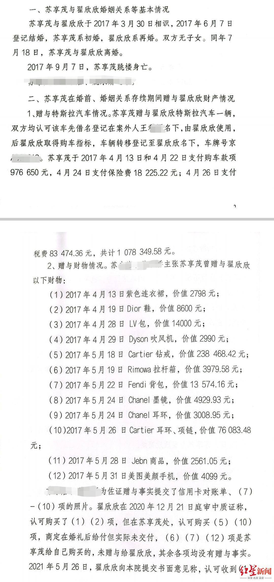 赠予合同纠纷一案判决书显示,根据审理查明的情况,翟欣欣与苏享茂相识至协议离婚仅110余天,期间收受苏享茂赠与的车辆、物品、款价值超过300万元,婚恋过程具有明显的经济特征。
