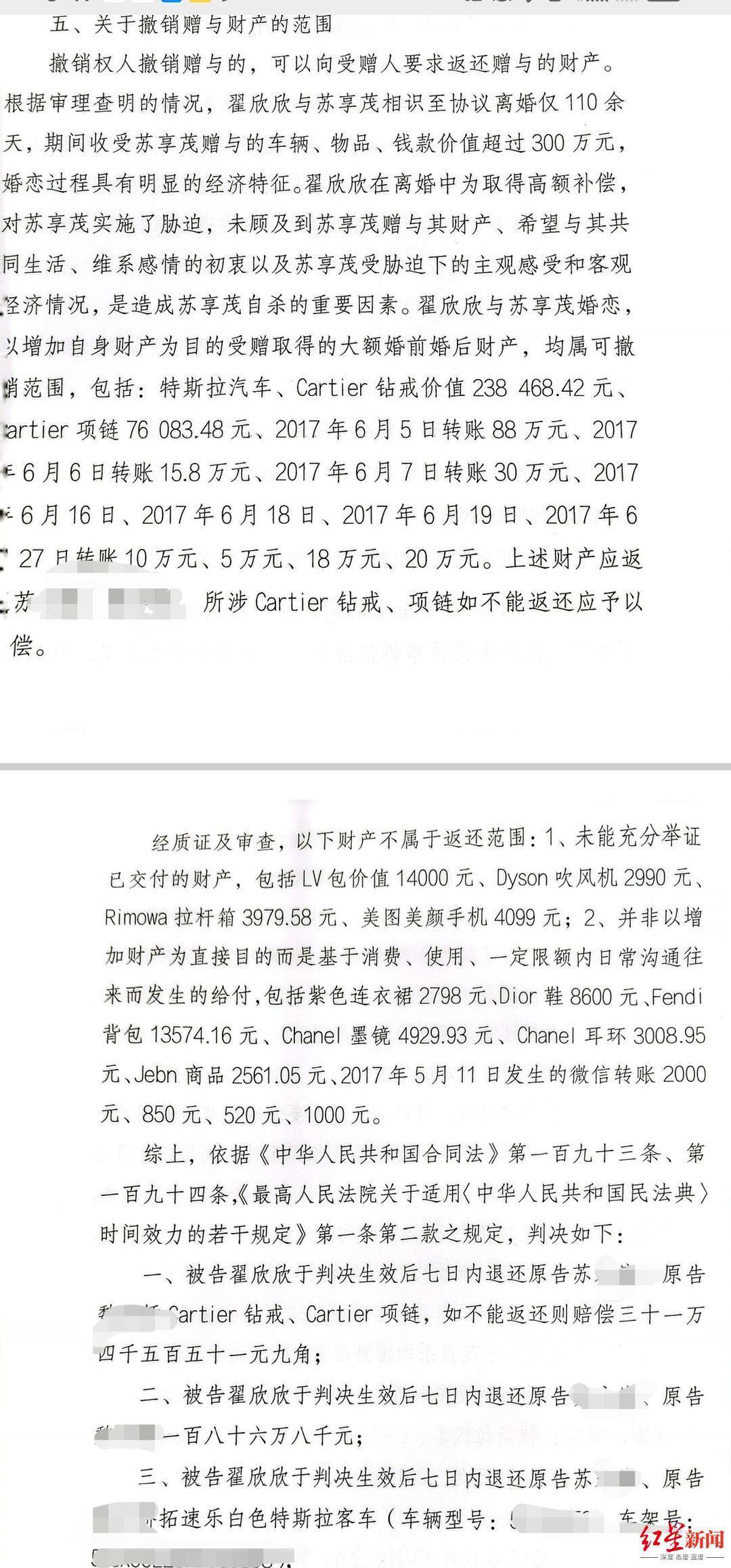 根据此份判决,翟欣欣需退还苏享茂家属价值约108万元的特斯拉汽车一辆;退还价值30余万的卡蒂尔钻戒和项链;退还转账共计186万余元。