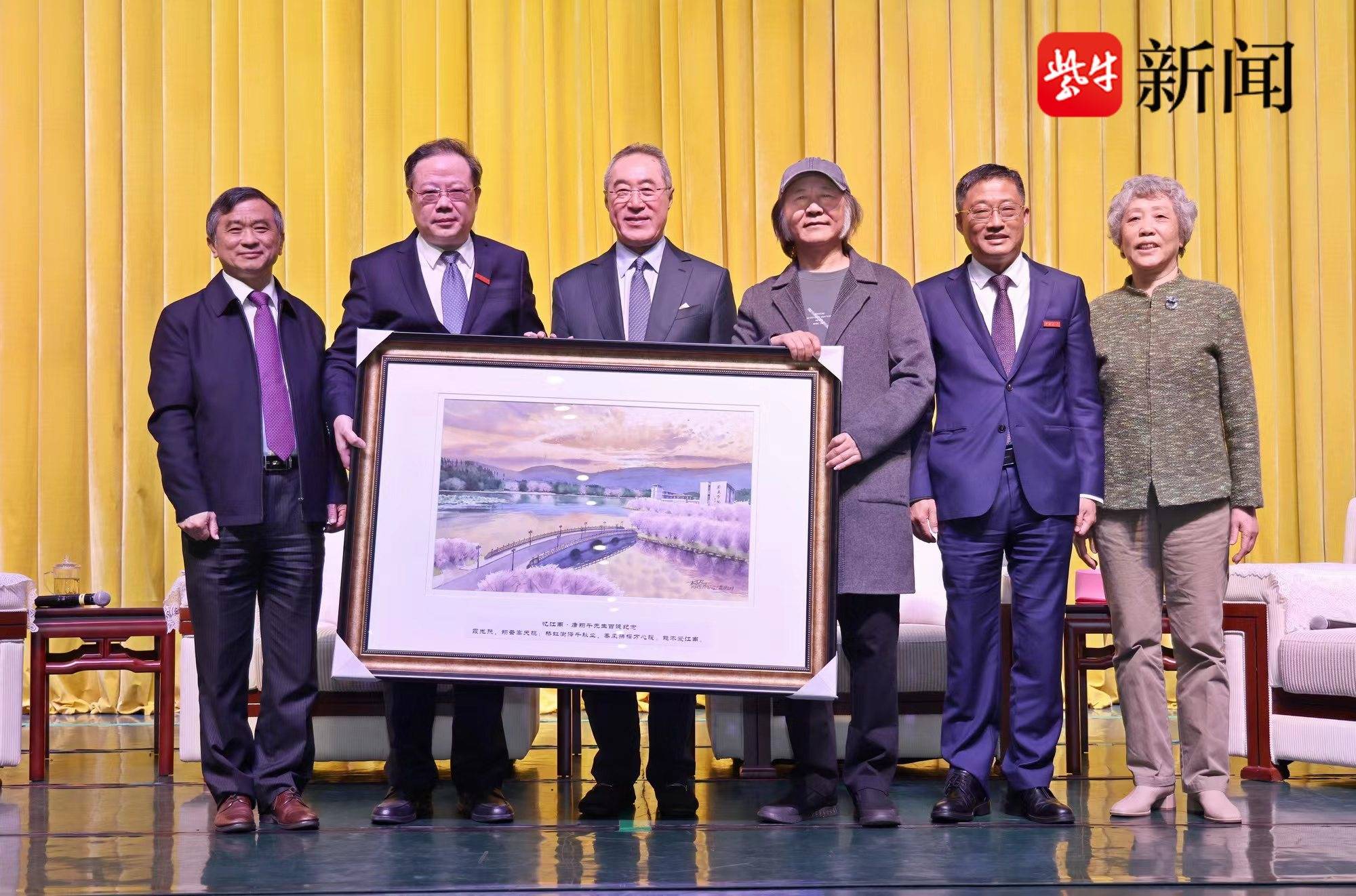 朱庆葆与江南大学杨茂川教授一同向唐英年先生赠送水彩画,藉此表达江南大学师生对唐氏家族的感恩之情。