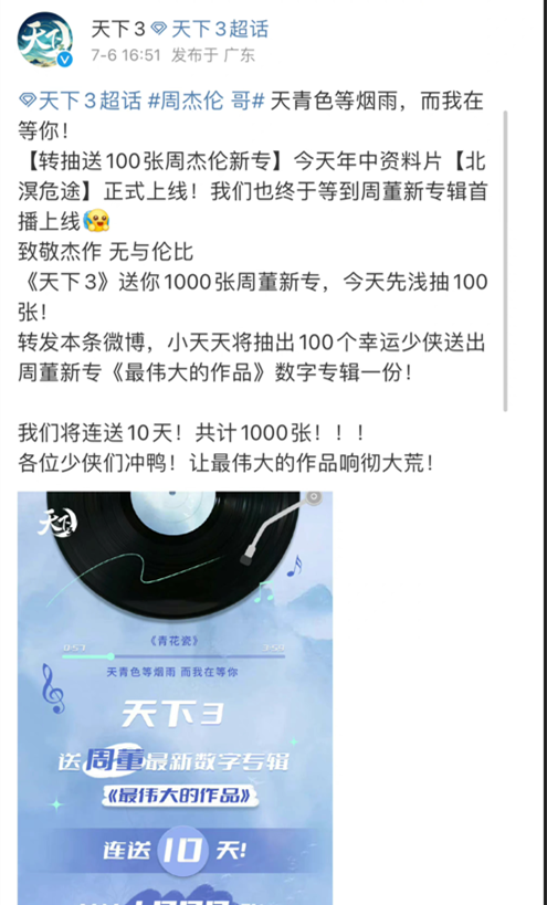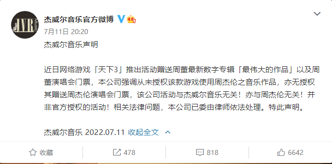 由此,引发双方纠纷的原因可能要追溯到去年的7月。2022年7月,周杰伦新专辑发行,引发了歌迷们的关注,7月6日,网易雷火出品的游戏《天下3》在微博发布“转抽送100张周杰伦新专”的活动,在活动详情中,官方表示游戏新资料片正式上线,恰逢周杰伦新专辑首播上线,因此官博将抽取100名转发的玩家,每位玩家送出新专《最伟大的作品》数字专辑一份。对于《天下3》的活动,周杰伦方面显然并不认可,7有11日,杰威尔音乐官博发表声明,表示“本公司强调从未授权该游戏使用周杰伦之音乐作品,亦无授权其赠送周杰伦演唱会门票,该公司活动与杰威尔音乐无关,亦与周杰伦无关,并非官方授权活动。”