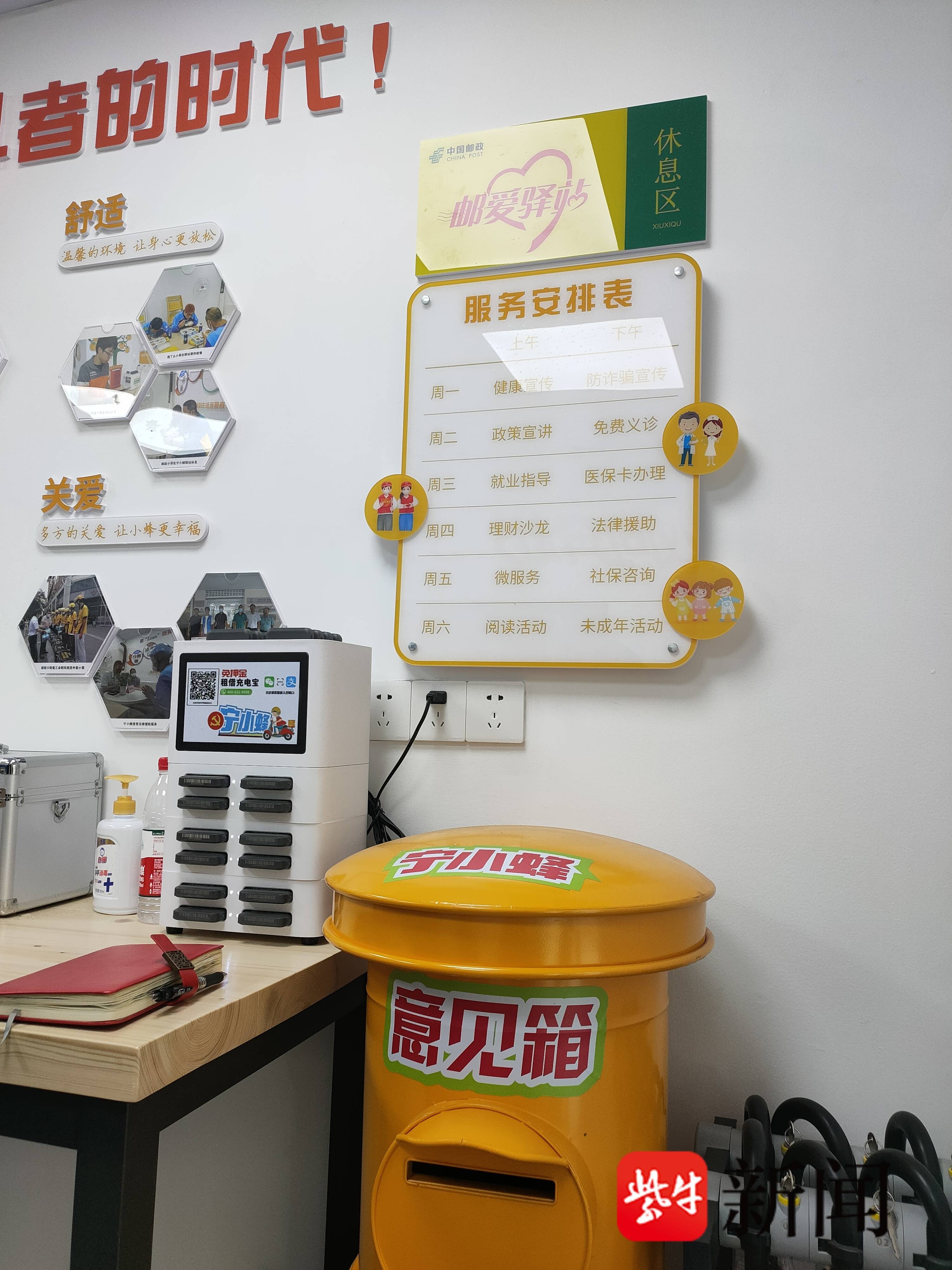 “宁小蜂·丹凤邮家”就在车马喧腾的丹凤街上,这里各类商业业态的门面房鳞次栉比,门口就是多趟公交车站,交通很是便捷。驿站内约50平方米,进门就看见墙北边挂着在此提供服务或合作的相关机构牌章,如大石桥社区党委、中国邮政南京玄武区分公司党总支、江苏广电集团、顺丰快递、苏粮集团、京东快递、饿了么等,服务的供求关系一目了然;墙上南边,悬挂着周一至周五的服务内容,包括就业指导、政策宣讲等各种“微服务”;墙正面,就是驿站的服务对象外卖、快递员及网约车司机的“心愿墙“:我想给父亲买两瓶好酒,这是饿了吗外卖送餐员小刘师傅写的,很快,他的心愿被驿站支持单位“赛格数码党支部”认领了。我想给父母买一只电动洗脚盆,这是顺丰快递员小李师傅写的,他的心愿被珠江路“艺之行教育党支部”认领了。