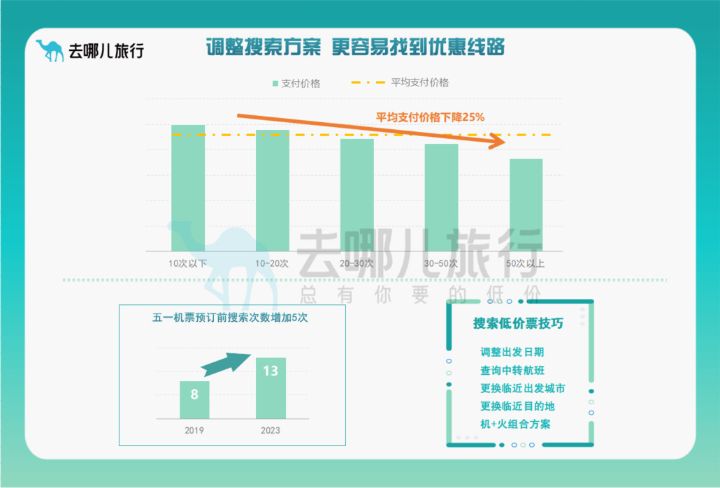 数据统计,节假日前,用户预订前平均搜索量为13次,较2019年平均增加5次。通过调整搜索方案,更容易淘到低价票。搜索比价50次以上的用户比搜索10次以下的用户,淘到低价票的概率更高,平均支付价格低四分之一。