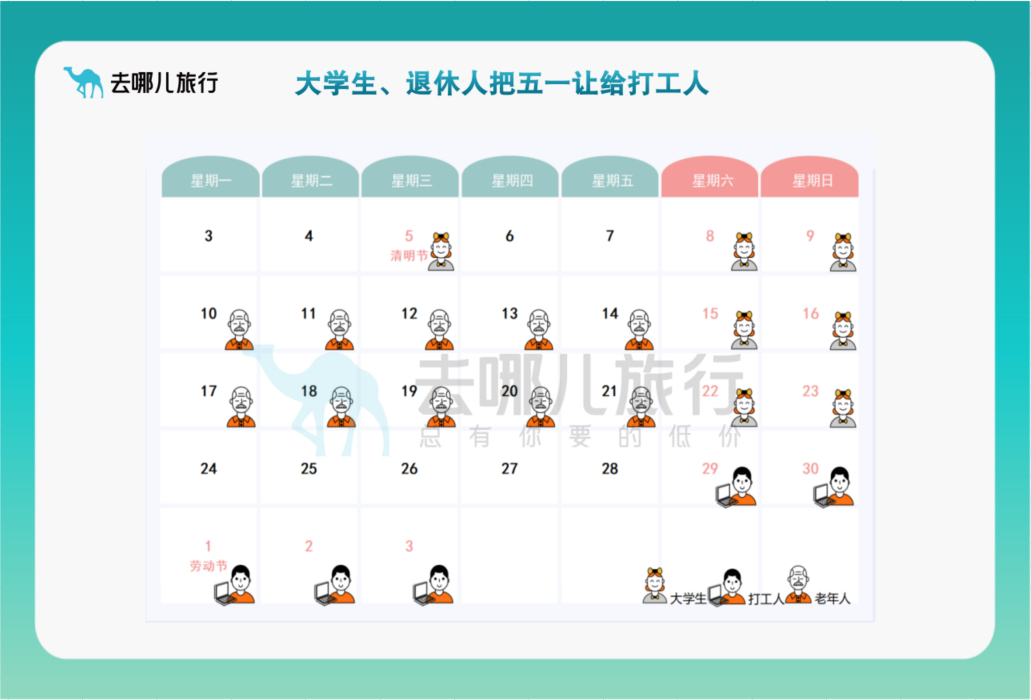 4月3日是老年旅客返程的小高峰,与大学生一样,今年老年旅客也把五一让给了打工人。去哪儿数据显示,截至4月12日,老年旅客五一机票预订量同比2019年下降一成。