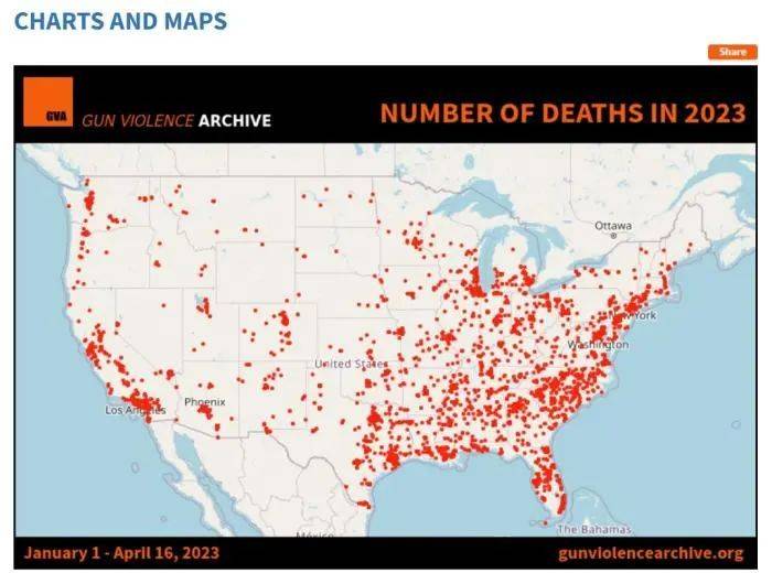 2023年1月1日至4月16日,美国枪支暴力事件分布图。图片来源:美国“枪支暴力档案”网站截图