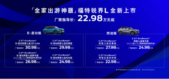 4月22日,长安福特锐界L南京地区联合上市会顺利举行。一辆全家出行神器、一个全家出游胜景、一段全家出游大道、一次体验多个场景,活动让业内媒体和意向车主沉浸式体验了锐界L的出行生活方式。与此同时,长安福特锐界L宣布正式登陆南京市场——本次上市的锐界L共有7款车型,2.0T燃油版售价为22.98—27.98万元,E-混动版车型为24.98—30.98万元。