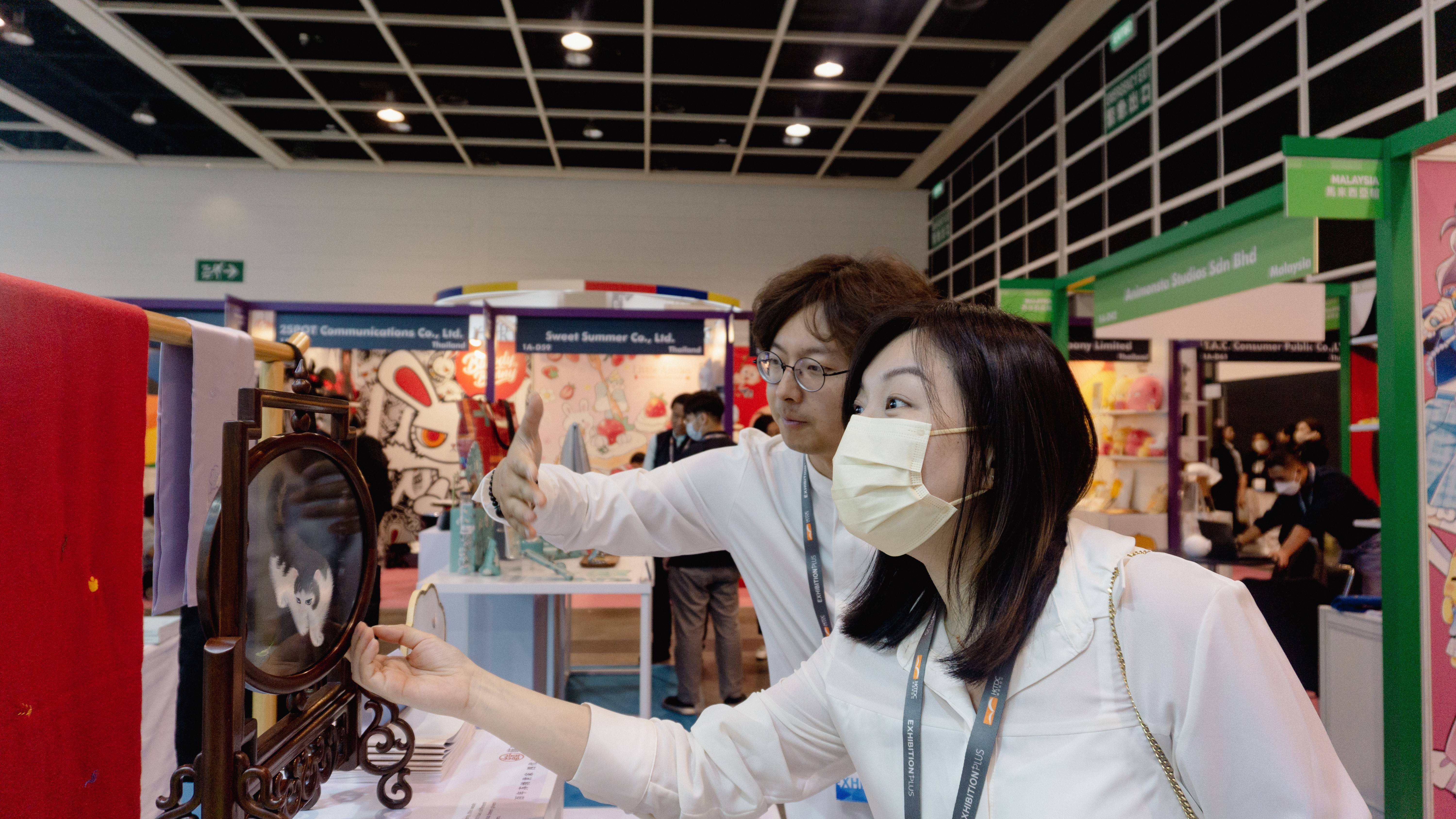 “水韵江苏”展区以“文化赋能、创意焕新”为核心主旨,在深耕前端IP交易的同时,打通授权产业链,推动优秀的江苏文化IP与产品更好地走进国际市场。展会开幕当日,文化和旅游部港澳台办副主任孔伦,香港特别行政区贸易发展局总裁方舜文、副总裁张淑芬、经济发展局副局长陈百里、贸易发展局驻江苏代表佘蓓蓓等嘉宾参观了“水韵江苏”展区,对清新独特的展区设计、特色鲜明的展陈、琳琅满目的产品赞不绝口。