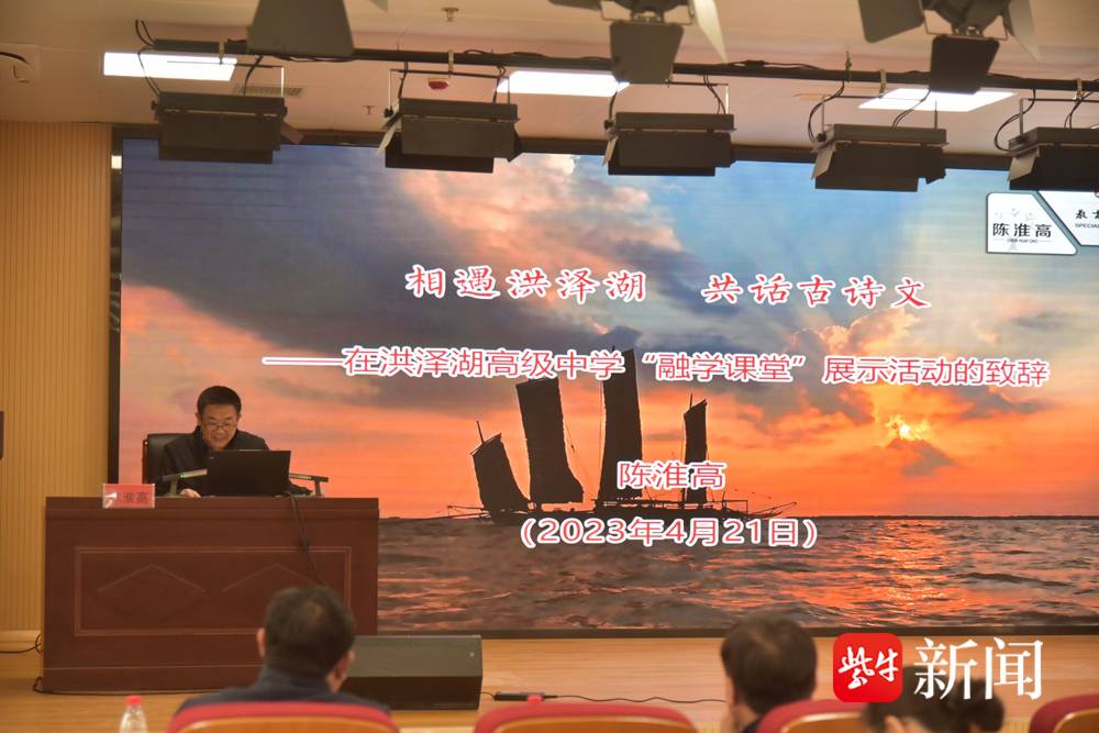 扬子晚报网4月26日讯(朱鼎兆)洪泽湖畔,春意融融。近日,省内外多位专家、名师及淮安、盐城、连云港部分语文教师齐聚淮安市洪泽湖高级中学,共同研讨“古诗文”教学,探索教师专业化成长之路。本次淮安市融学课堂“古诗文教学”展示活动由淮阴师院文学院、淮安市教学研究室、淮安市陈淮高名师工作室、江苏省研究生工作站主办,由淮安市洪泽湖高级中学承办。