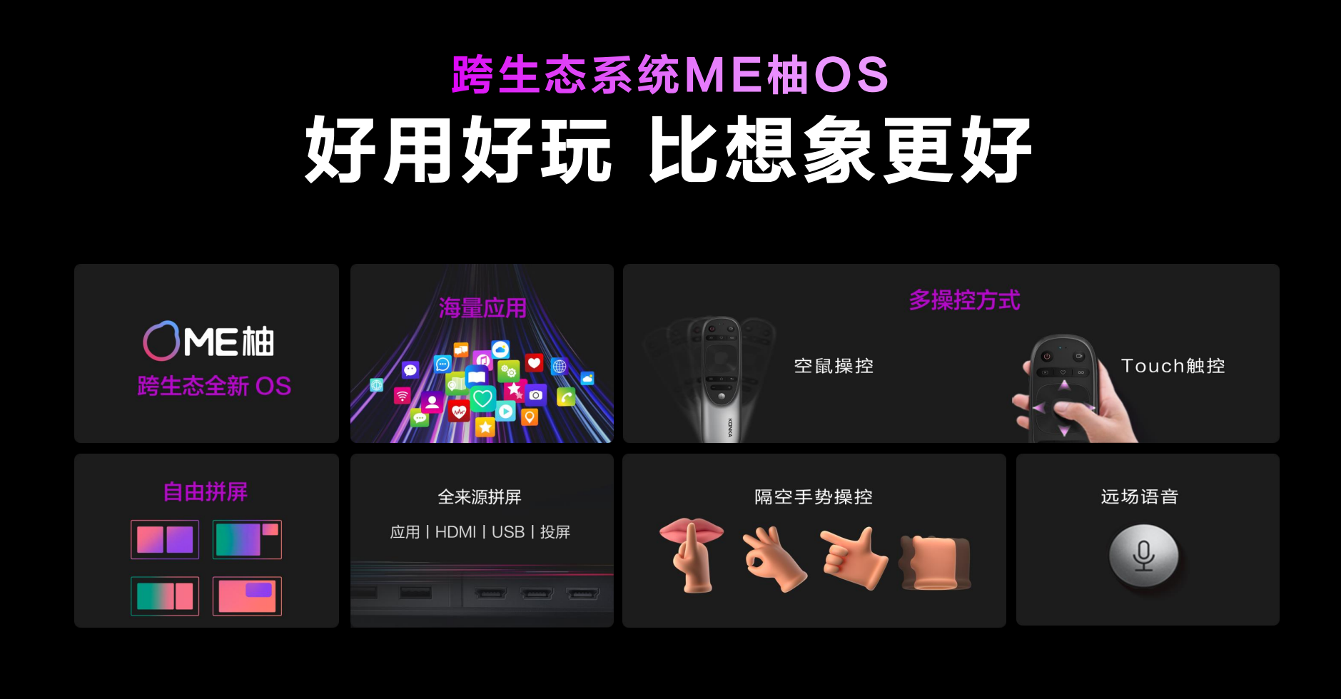 康佳A6 MAX搭载全新大屏软件操作系统ME柚OS,支持自由拼屏、多种操控方式、海量应用等多种功能。多窗口的视频源支持app应用、手机、电脑的投屏。康佳A6 MAX还支持空鼠操控、触控、手机同屏操控等多种控制方式,其标配的遥控器空前强大,内置高精陀螺仪,轻轻晃下就能变身智慧飞鼠,屏幕中的光标随心应手,指哪打哪。