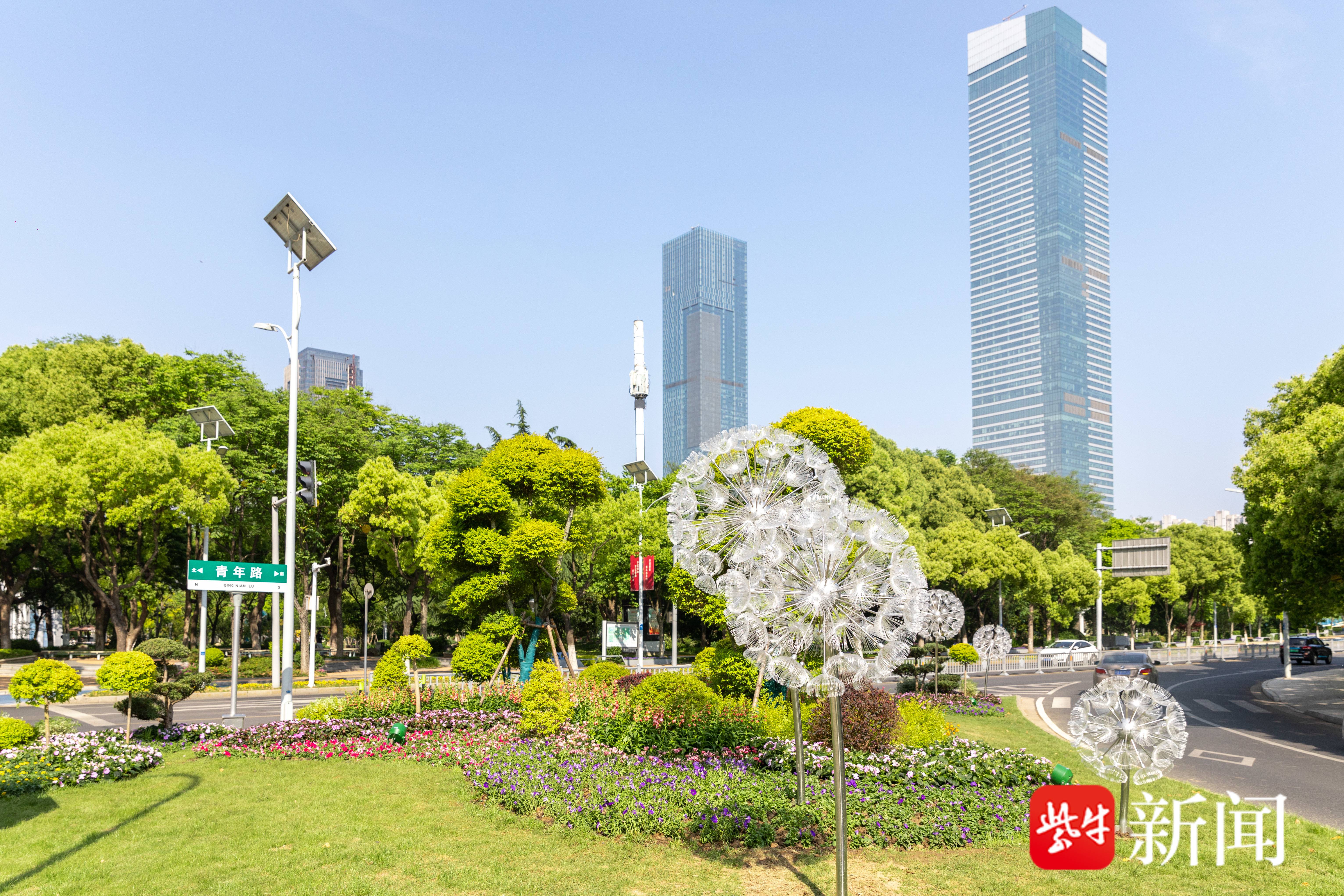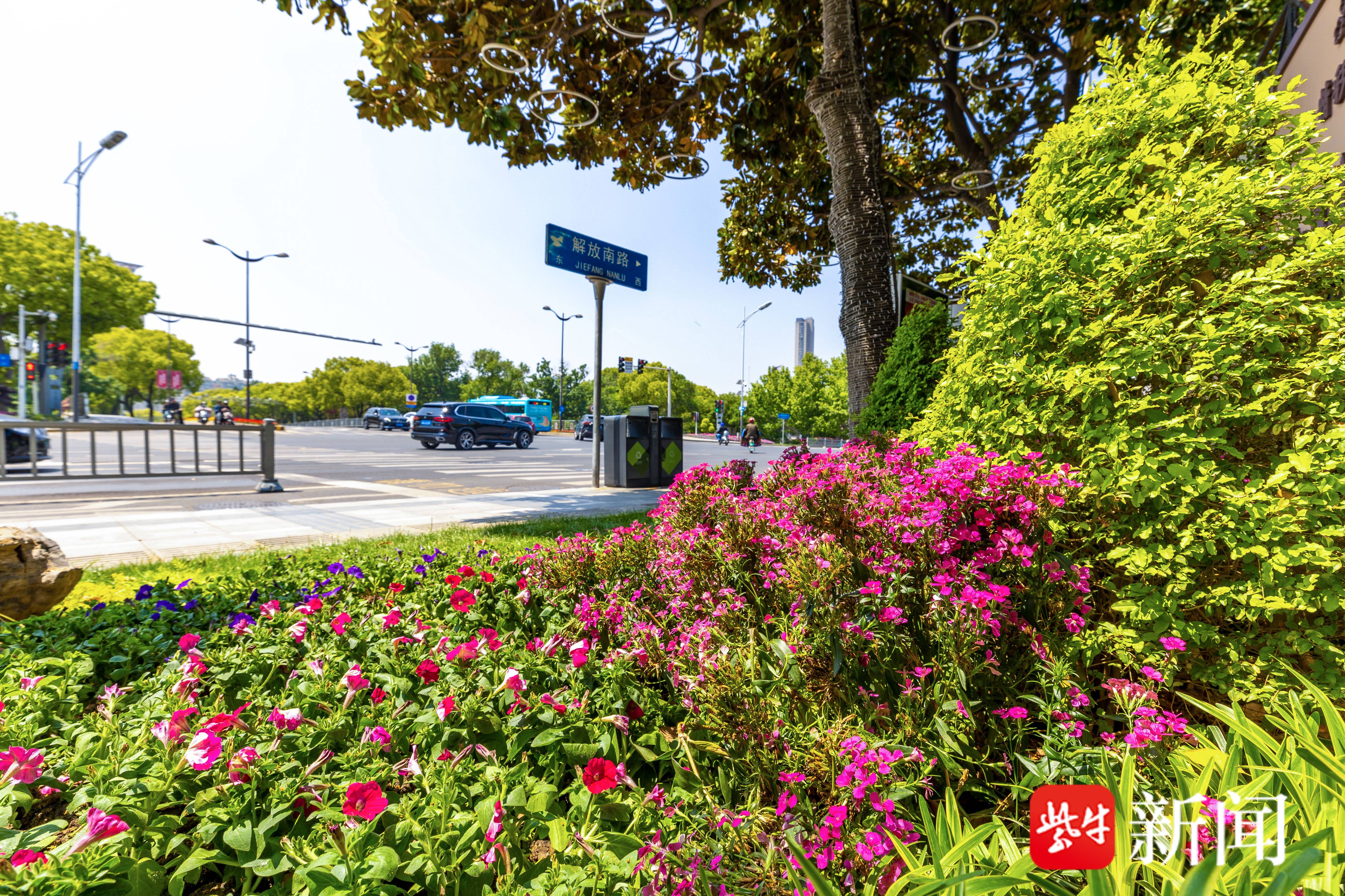 解放南路与清扬路路口:花卉布置以整齐块面为造型,总面积约120㎡,采用色彩艳丽、花量饱满的品种,营造时尚感街头景点。
