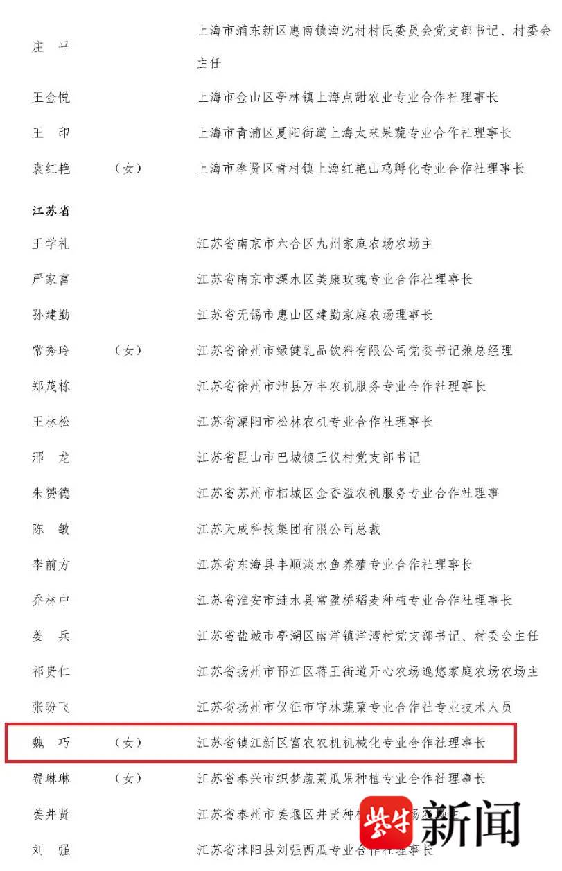 镇江魏巧入选!全国农业农村劳动模范和先进工作者拟表彰对象公示