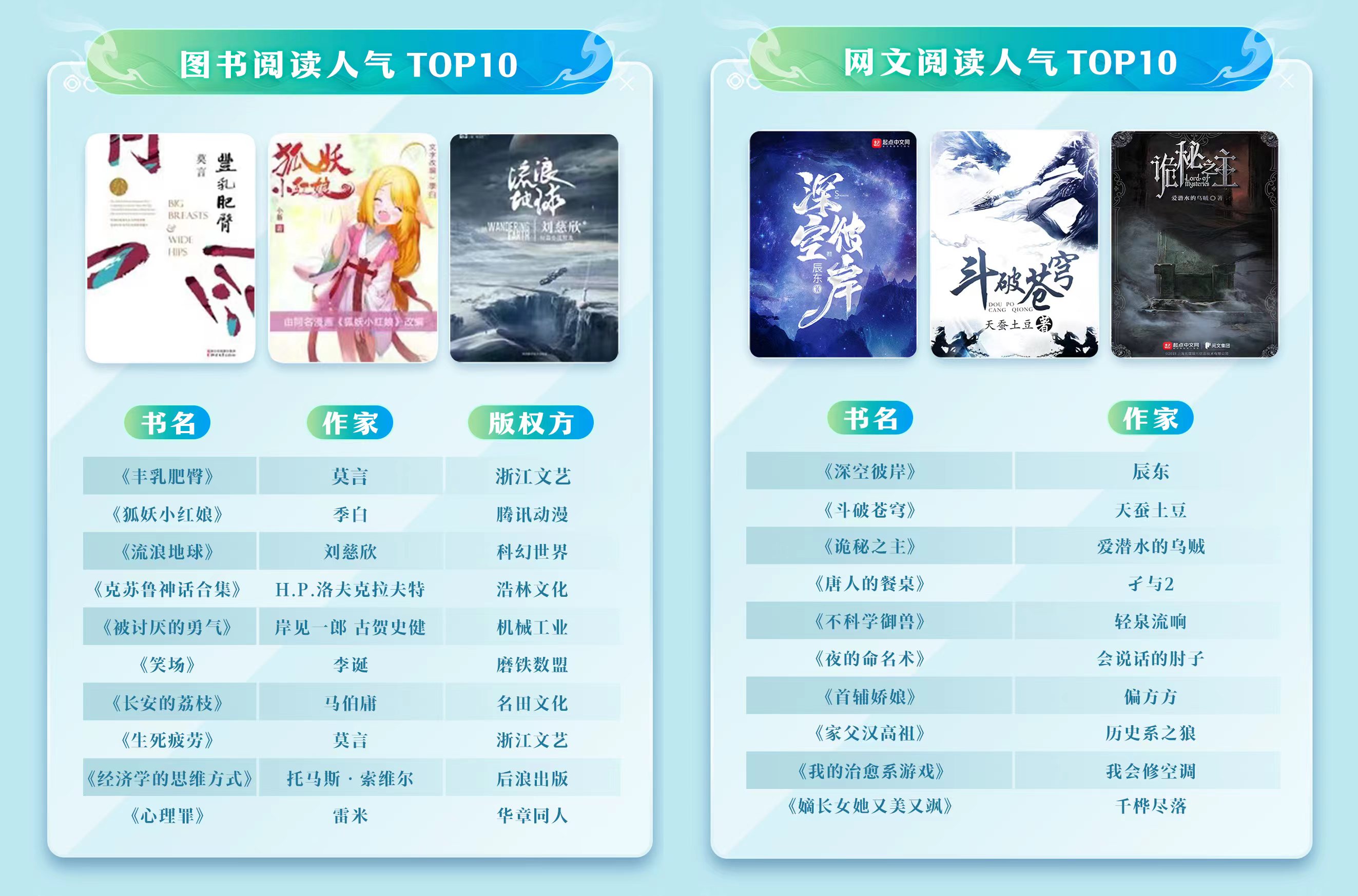 数字阅读高人气的背后,离不开精品内容的驱动。其中,诺贝尔文学奖得主莫言的《丰乳肥臀》、腾讯动漫出品的热血国漫同名小说《狐妖小红娘》、中国科幻巅峰之作《流浪地球》、《吐槽大会》总策划李诞首部作品《笑场》等稳居图书阅读人气TOP榜,诸多跨时代优秀作品的魅力得以在数字载体中延续和放大;打破网文首订纪录的《深空彼岸》、生命力超十年的经典网文《斗破苍穹》、打破网文诸多记录的现象级作品《诡秘之主》、中国科幻最高奖“银河奖”获奖作品《夜的命名术》等优秀作品,则荣登网文阅读人气TOP榜。
