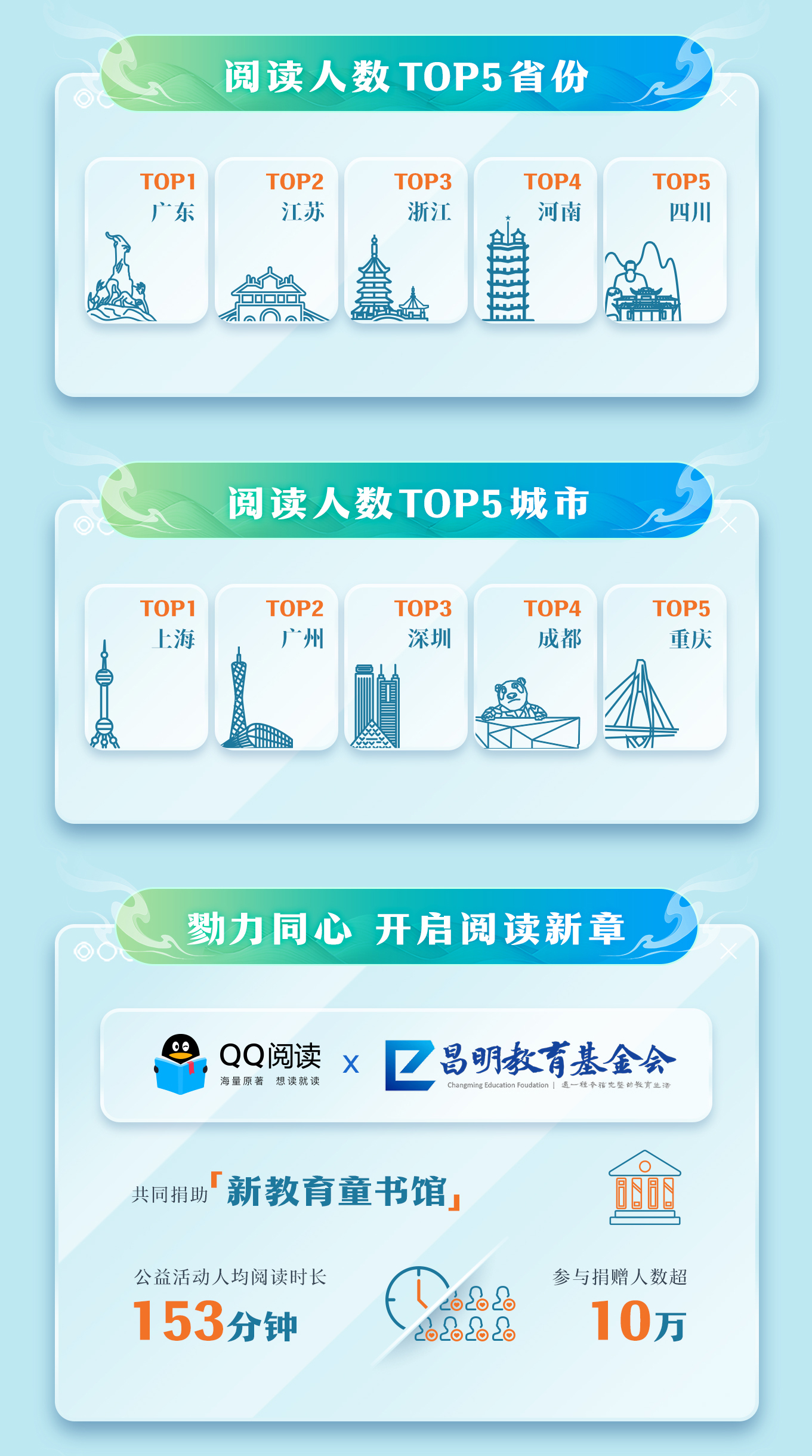 “数字阅读周”期间,QQ阅读还联合江苏昌明教育基金会共同发起“谢谢阅读”系列活动,面向乡村小学捐建“新教育童书馆”,合力推动阅读普惠、青少年阅读公益事业。数据显示,超10万用户参与了乡村阅读助力,为经典书籍走进每一间教室贡献出自己的一份力量。