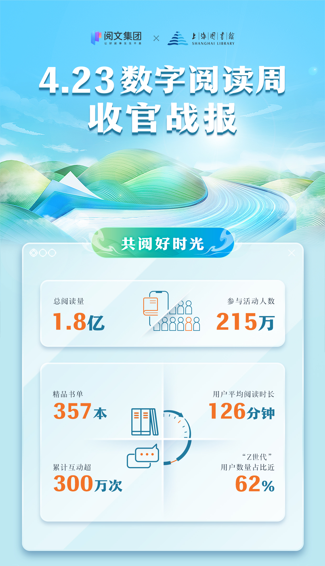 数据显示,自4月20日至5月3日,共计215万人沉浸“数字阅读周”共阅好时光,357本好书总阅读量高达1.8亿,“高黏性”同样成为本次“数字阅读周”的突出特点,活动期间用户平均阅读时长126分钟。