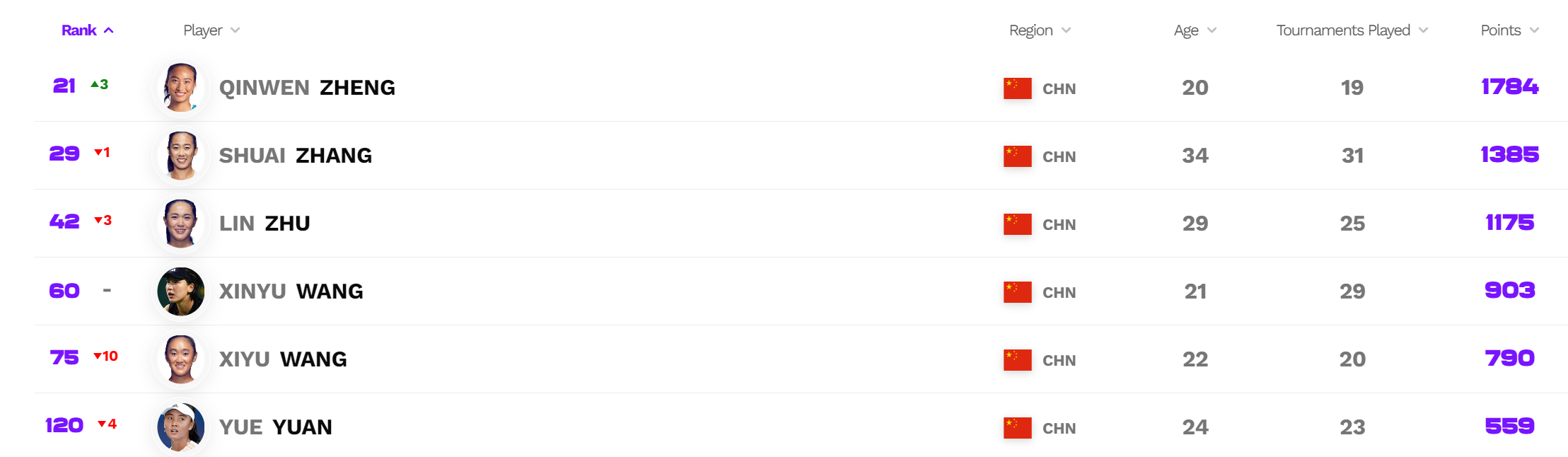 女单中国选手中,郑钦文上升3位,排名第21位,刷新个人最佳排名。张帅位列第29,朱琳第42,王欣瑜第60,王曦雨第75,袁悦第120。