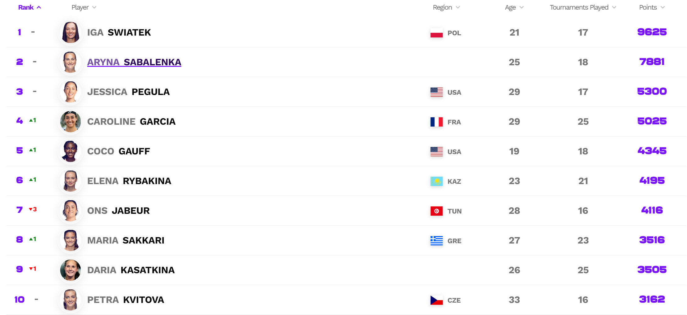 此外,斯瓦泰克、萨巴伦卡、佩古拉继续高居前三,加西亚、高芙、莱巴金娜各上升一位,分列四到六名,贾巴尔下滑三位名列第七。