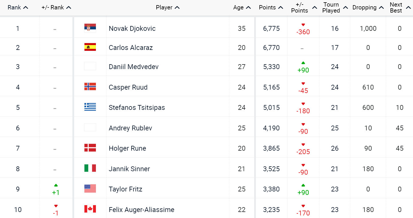 值得注意的是,排名榜首的德约科维奇仅领先位居次席的阿尔卡拉斯5分。由于德约科维奇在接下来的罗马大师赛中有1000分的卫冕冠军积分,因此只要阿尔卡拉斯能在罗马大师赛第二轮登场参赛,就能确保至少收获10个积分,从而在罗马大师赛结束后重回世界第一,并以头号种子的身份出战法网。