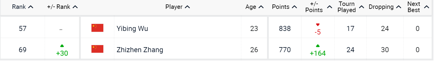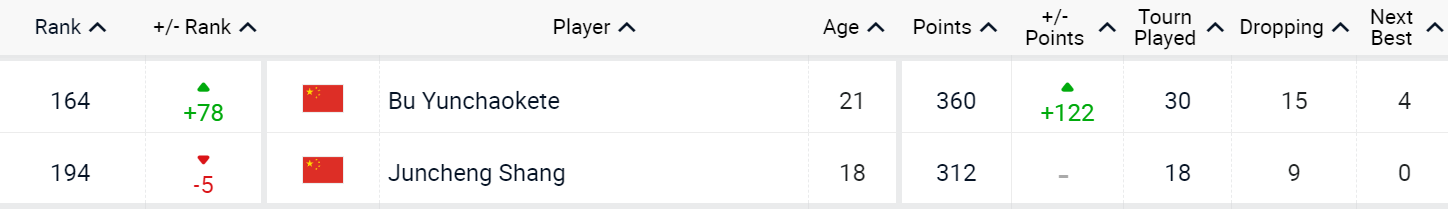 中国选手中,吴易昺继续排名第57位。凭借着上周在马德里大师赛中闯入八强的出色表现,张之臻排名飙升30名,来到第69位,创造个人最佳。近来在挑战赛中表现抢眼的布云朝克特同样刷新个人最佳,他提升78位,目前排名第164名。商竣程下降5位,排名第194名。