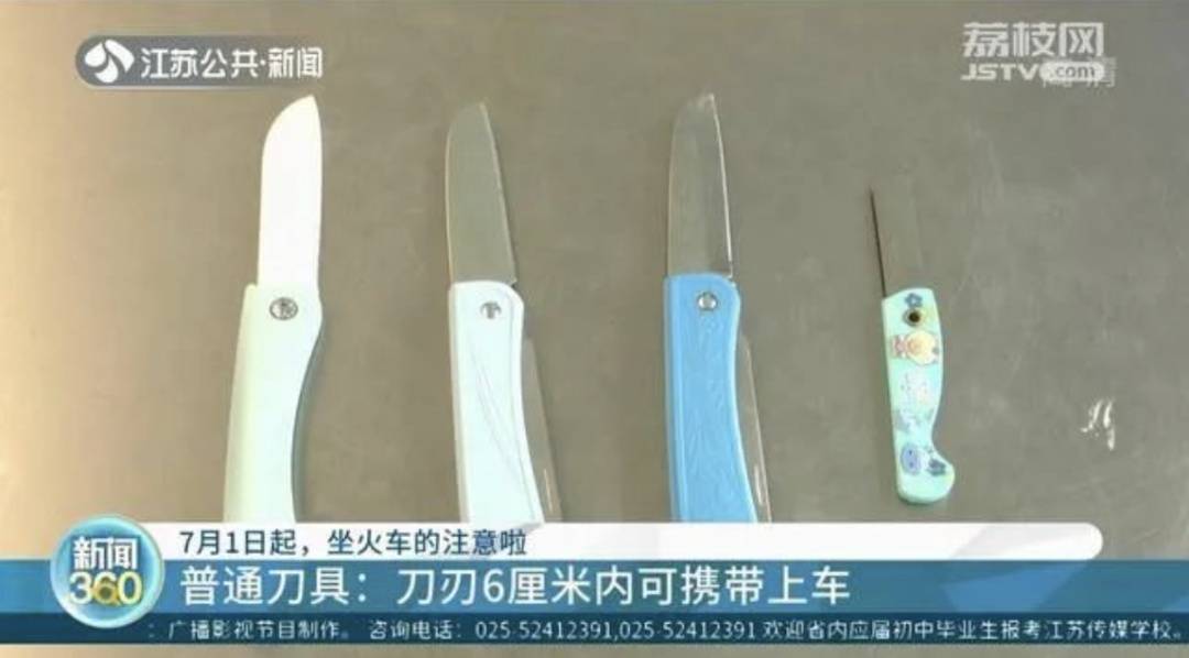 江苏公共·新闻频道《新闻360》报道:2022年7月1号以后,刀刃在6厘米以内的可以携带上火车。 图源:江苏新闻