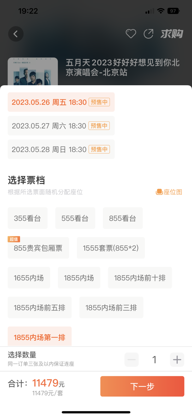 5月11日,贝壳财经记者登录大麦网发现,此次五月天演唱会票价从355元到1855元,所有票档全部呈“缺货登记”状态。值得注意的是,两场演唱会想看人数已经超过230万。