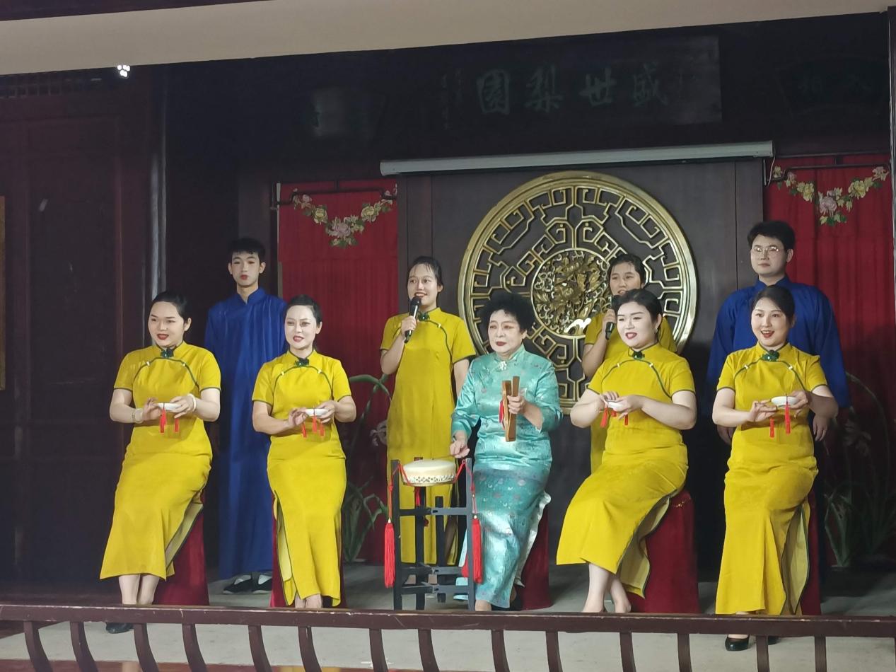 舞台上,南京白局省级非遗代表性传承人黄玲玲老师,穿着一袭湖水绿底的云锦旗袍,徒弟们穿着明媚的秋香黄旗袍,光彩照人。她和徒弟们联袂表演了原创曲目《百年华诞颂党恩》,带去观众体验原汁原味的南京白局。