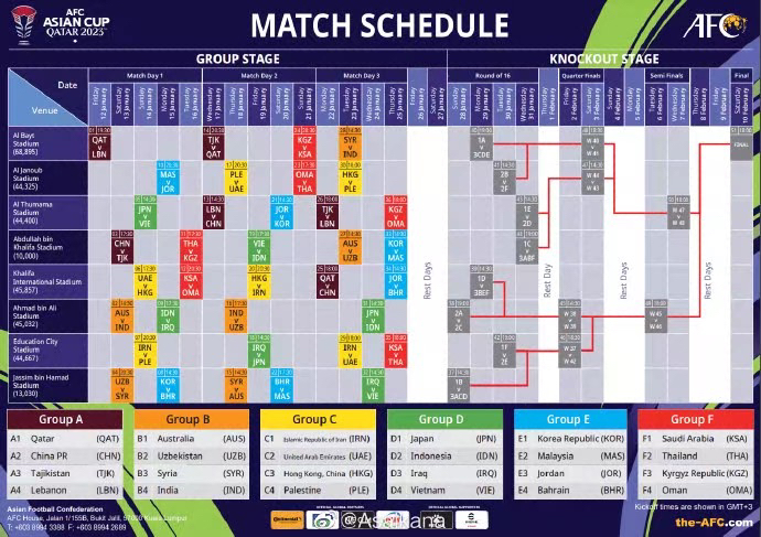亚洲杯赛程出炉:国足1月13日首战塔吉克斯坦 1月22日末战东道主卡塔尔