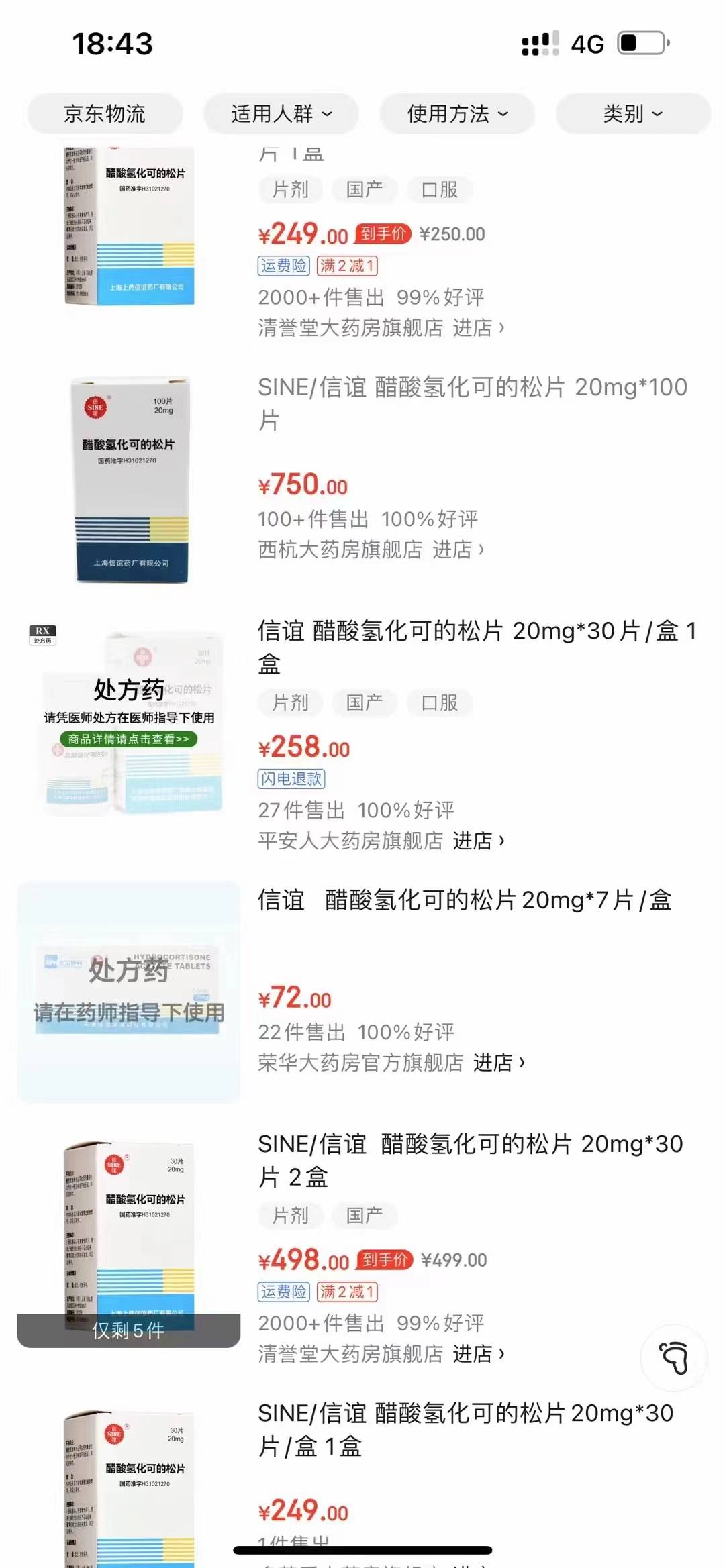 陈建敏回忆,2022年7月29日,京东健康查询到的醋酸氢化可的松公开价格信息是100片/瓶,每瓶68元,最近,医院和药房的价格已经变成9.86元/片,且不再有100片/瓶和30片/瓶的包装。网上一些渠道的价格更是天花乱坠,有30片/瓶289元,100片/瓶750元等。