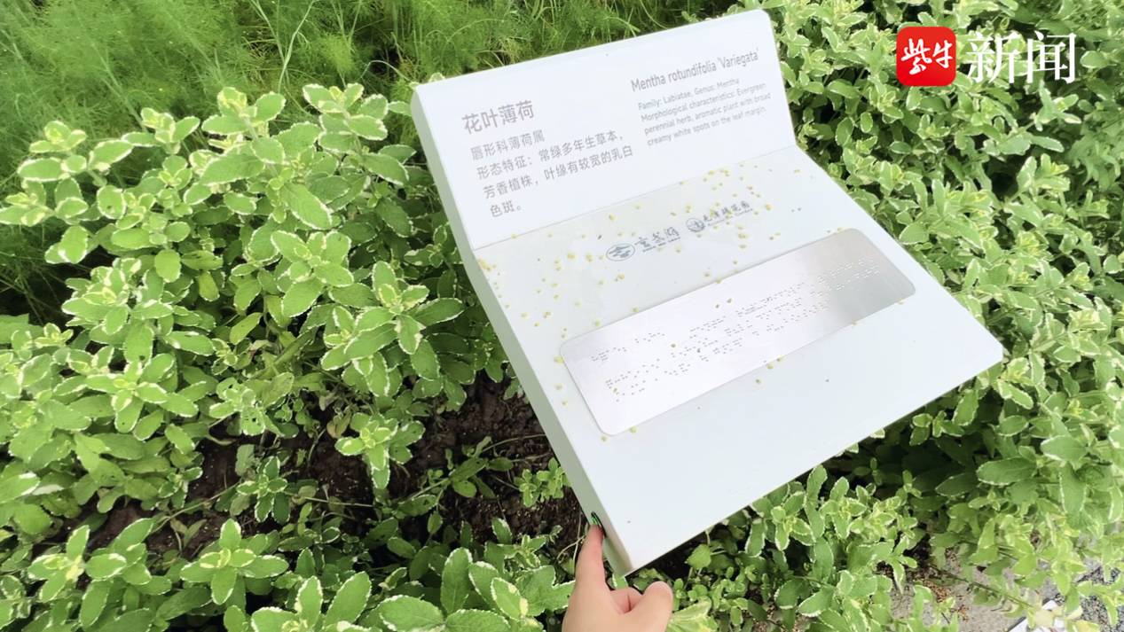 路过一片延伸向水面的“听水台”,盲道延伸至无障碍花园的核心区域。以视障朋友为主要服务对象,印着盲文的扶手包围全部步道,指引视障人士前进游览。据施工负责人介绍,花园核心区域共有18处印有盲文的标示牌,“按左边的按钮就能听见对应的语音介绍,盲人还能直接伸手去触摸周围的植物。”
