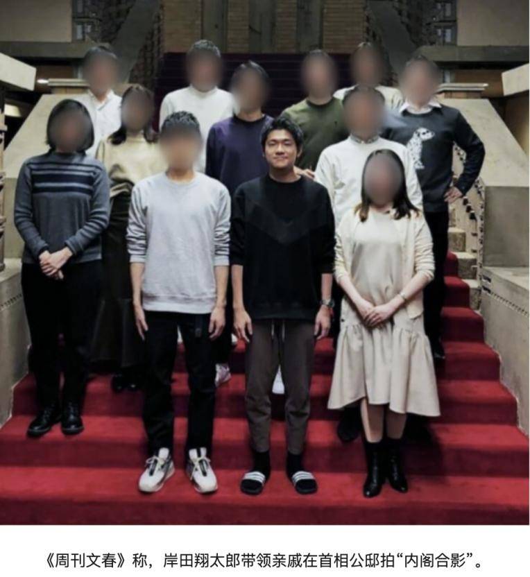 据日本《文春周刊》此前曝光岸田翔太郎在首相公邸举行聚会的照片显示,岸田翔太郎带着多名岸田家族的亲戚在首相公邸内,模仿新组建内阁的合影,岸田翔太郎本人站在首相应站的中间位置。此外,还有人模仿内阁大臣,或一边拍照一边“表演记者会”,或躺在首相公邸的楼梯上。