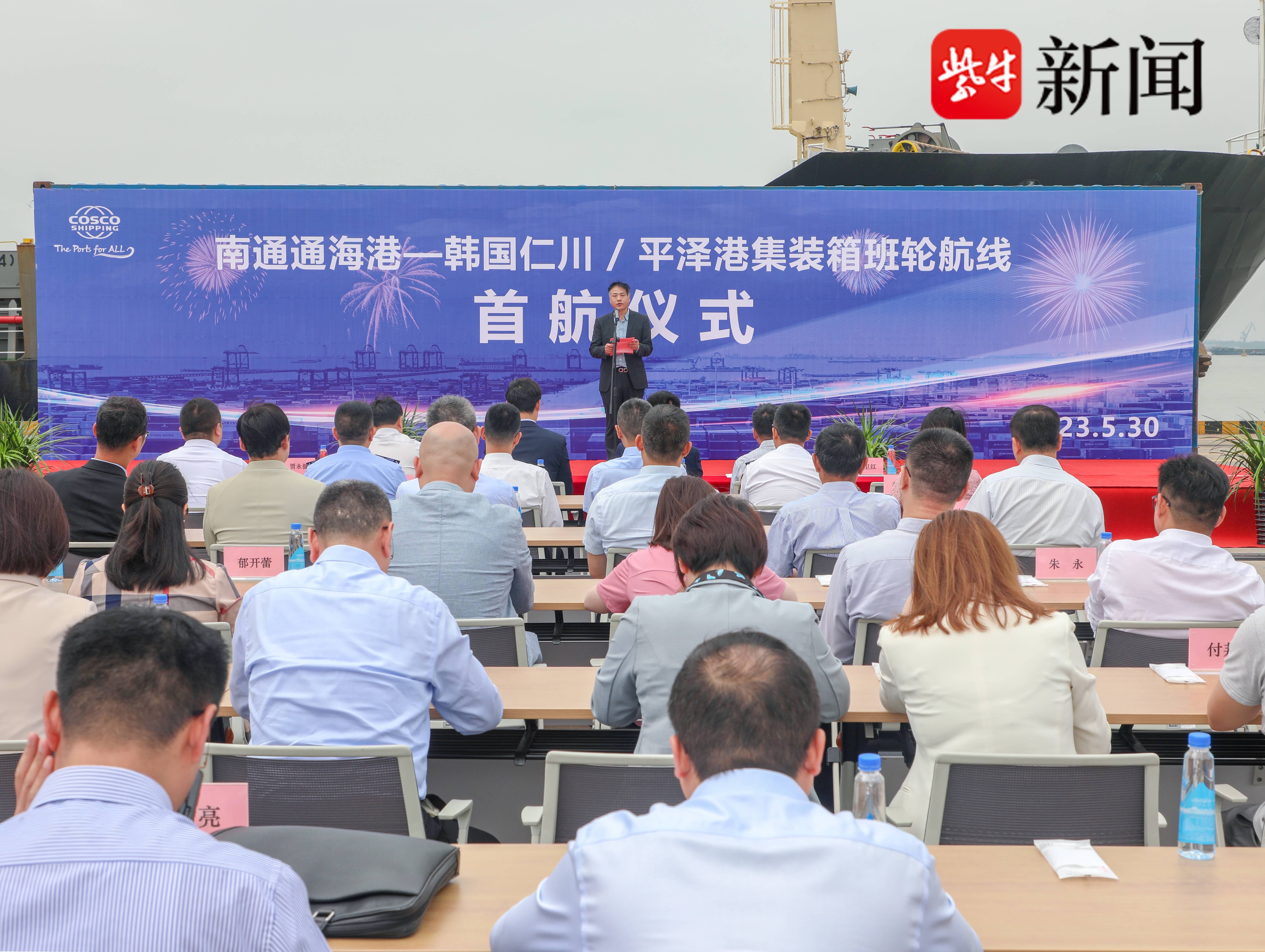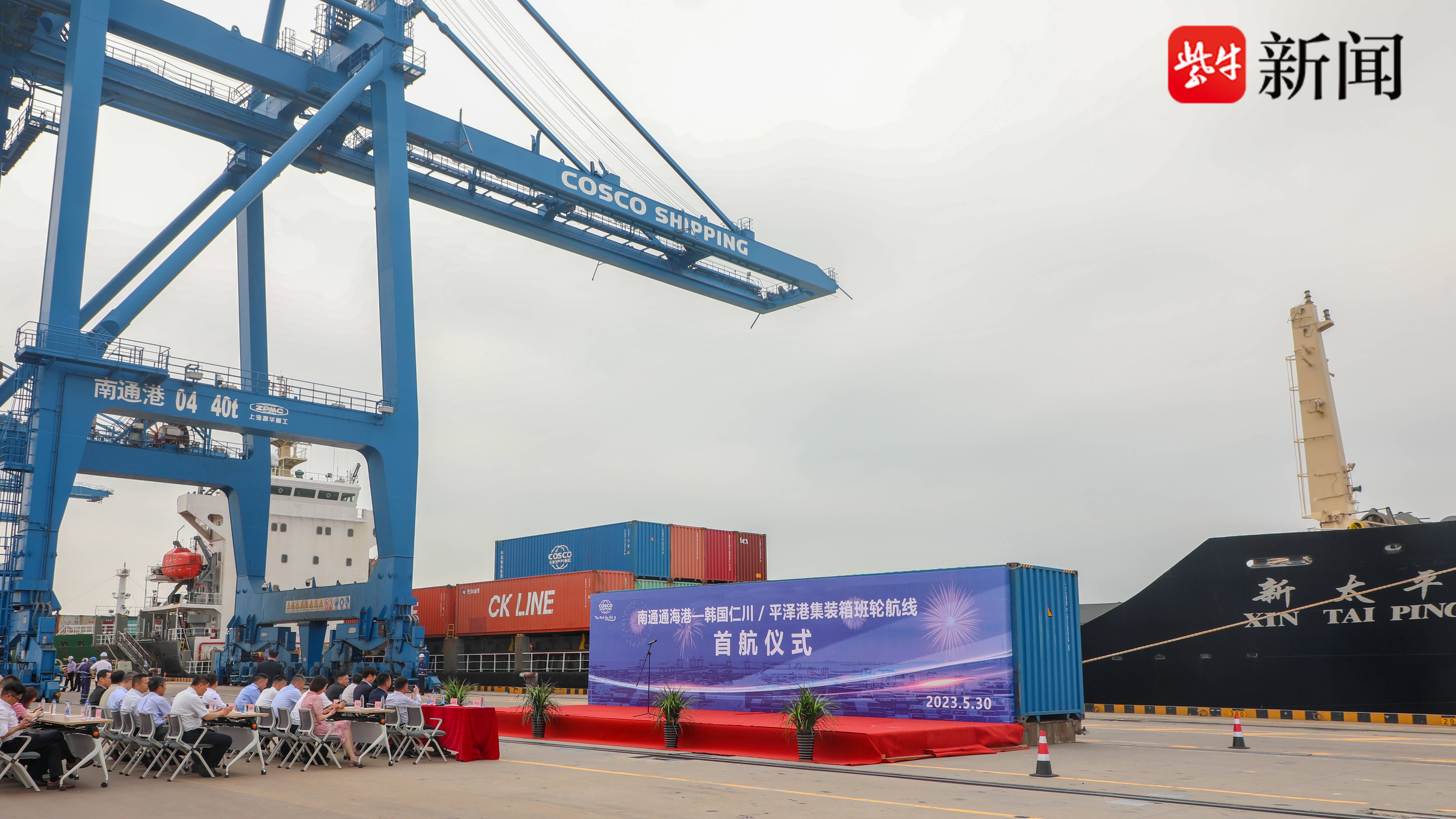 5月30日10时许,南通通海港—韩国仁川/平泽港集装箱班轮航线首航仪式在南通通海码头举行。随着最后一个集装箱装船成功,“新太平”轮缓缓驶离码头,标志着该港第4条日韩集装箱航线正式开通。