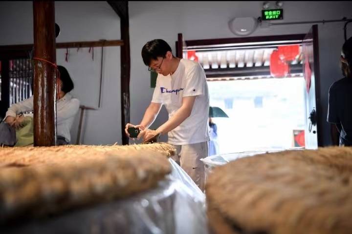 撒酒曲、翻米饭、装盒压实、发酵等待……在小镇沿河的民间酒坊内,采访团成员们切身感受甜酒酿的制作过程。一碗甜酒酿就是一场微生物之间碰撞的美味艺术,美食的诞生过程让媒体记者们惊叹不已。