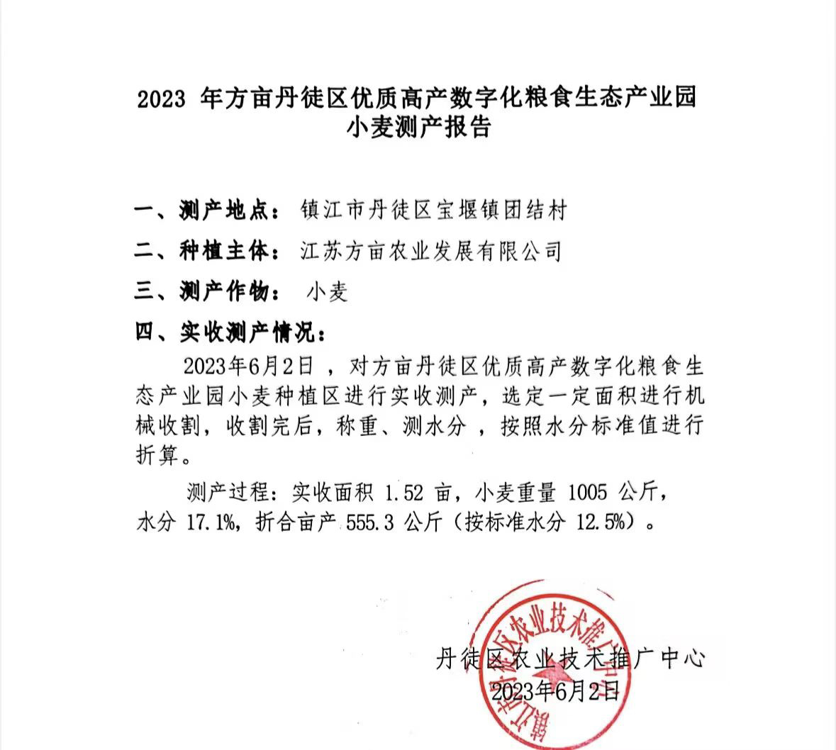 2日上午10时许,丹徒区农业技术推广中心与宝堰镇农业农村局组织的技术专家团队抵达宝堰镇团结村,对产业园中小麦进行测产。经过经机具检查、丈量面积、实收、称重、测量含水量、估算损失、折算实产等程序。测产结果显示,实收面积 1.52 亩,小麦重量 2010斤。水分 17.1%,折合亩产1110.6斤(按标准水分12.5%)。这一数据,远超往年最高亩产,并创下丹徒南部丘陵地区小麦高产纪录。