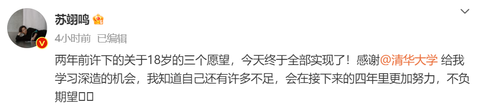 苏翊鸣随后在微博表示:“两年前许下的关于18岁的三个愿望,今天终于全部实现了!感谢@清华大学 给我学习深造的机会,我知道自己还有许多不足,会在接下来的四年里更加努力,不负期望。”