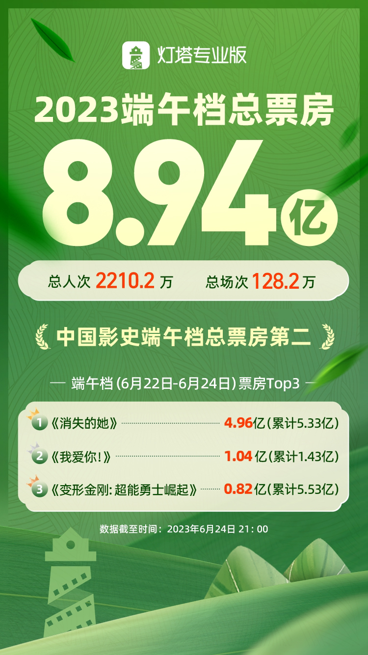 据灯塔专业版实时数据,截至6月24日21时,2023年端午档(6月22日-6月24日)总票房达8.94亿,成为中国影史端午档总票房第二,观影总人次2210.2万人,总场次128.2万场。