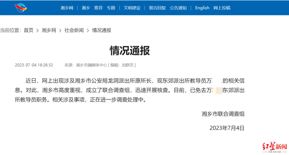7月4日晚,湘乡市联合调查组发出官方通报:近日,网上出现涉及湘乡市公安局龙洞派出所原所长、现东郊派出所教导员万某的相关信息。对此,湘乡市高度重视,成立了联合调查组,迅速开展核查。目前,已免去万某东郊派出所教导员职务。相关涉及事项,正在进一步调查处理中。