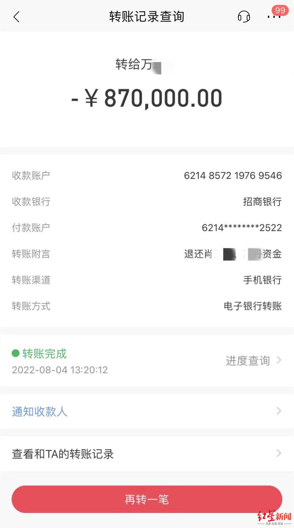 红星新闻记者了解到,网上实名举报之前,当事人已向中央政法委、国家信访局、湖南省纪检监察委等多个部门实名反映情况。相关转账记录显示,当地相关部门介入调查后,万某已先后分三次退回钱款50万元。