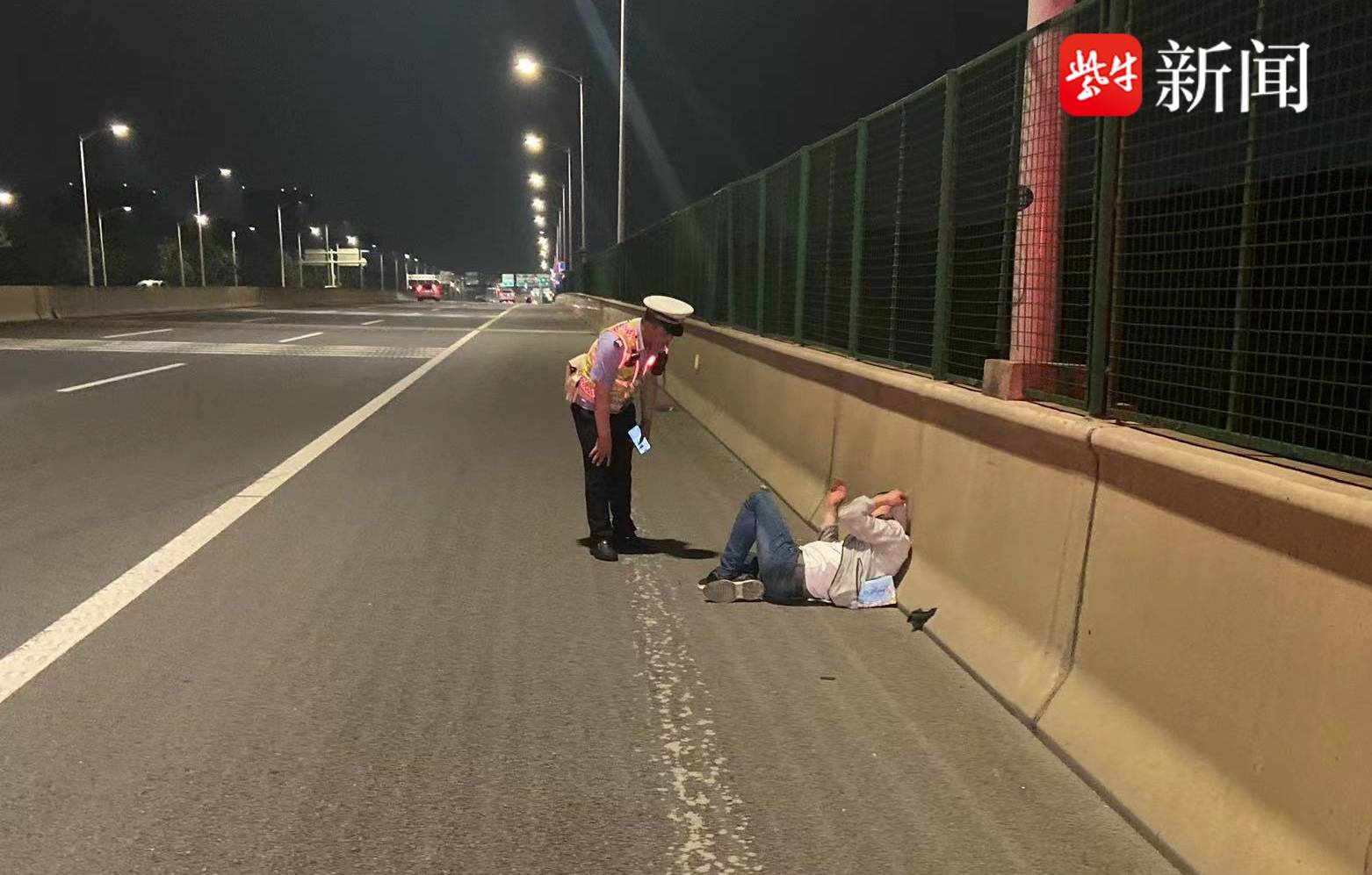 扬子晚报网7月8日讯(记者 郭一鹏 通讯员 王立) 前不久晚间,南京交警七大队西岗警务站警力开展日常巡逻,行至智谷大道高架摄山路上桥口附近时,突然发现一名男子躺在高架上的应急车道边。