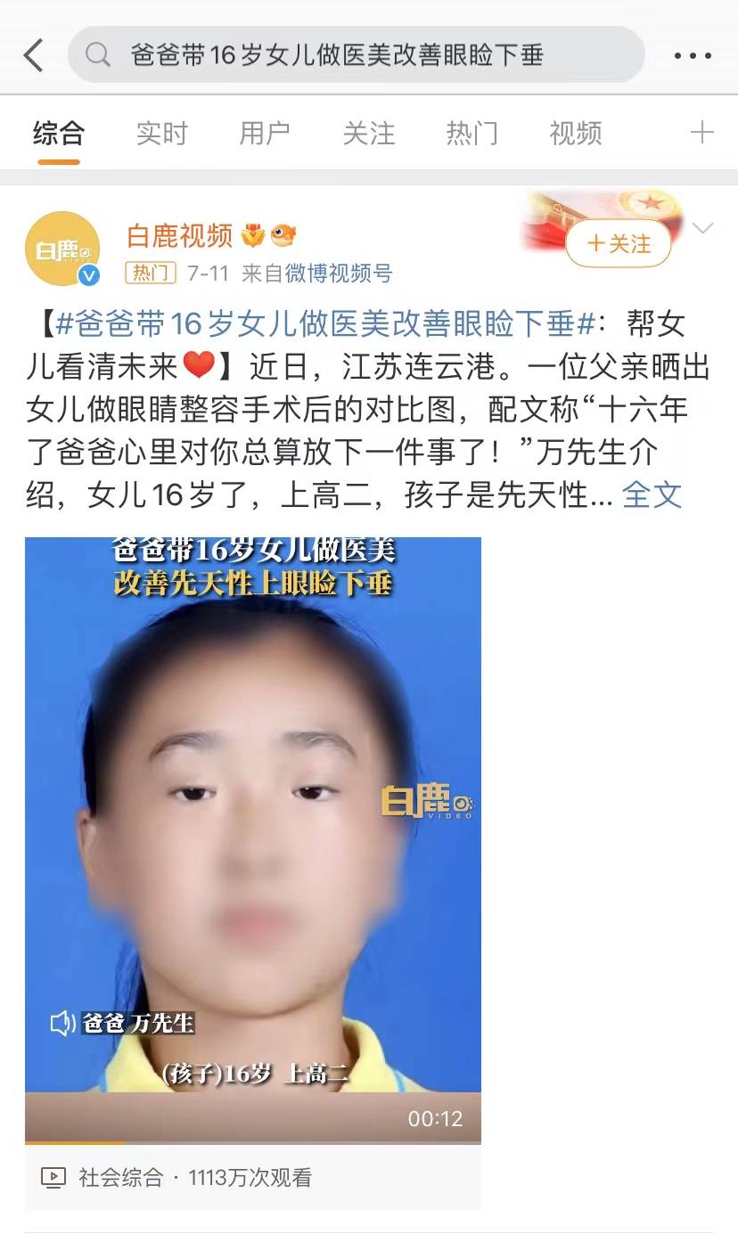 12日,#爸爸带16岁女儿做医美改善眼睑下垂#的话题引起不少人的关注。这位来自江苏连云港的父亲万先生晒出女儿做眼部手术后的对比图,可以看出,术前女孩儿的双眼细小无神,术后明显“睁开”了。万先生介绍,女儿今年16岁,上高二,是先天性上眼睑下垂,“若不把女眼睛治好,女儿看不清,父母也看不清她的未来。”记者发现网友留言中,有称赞爸爸思想开明的,但也有人表示,16岁做手术并不早,明明3岁就可以干预治疗了。