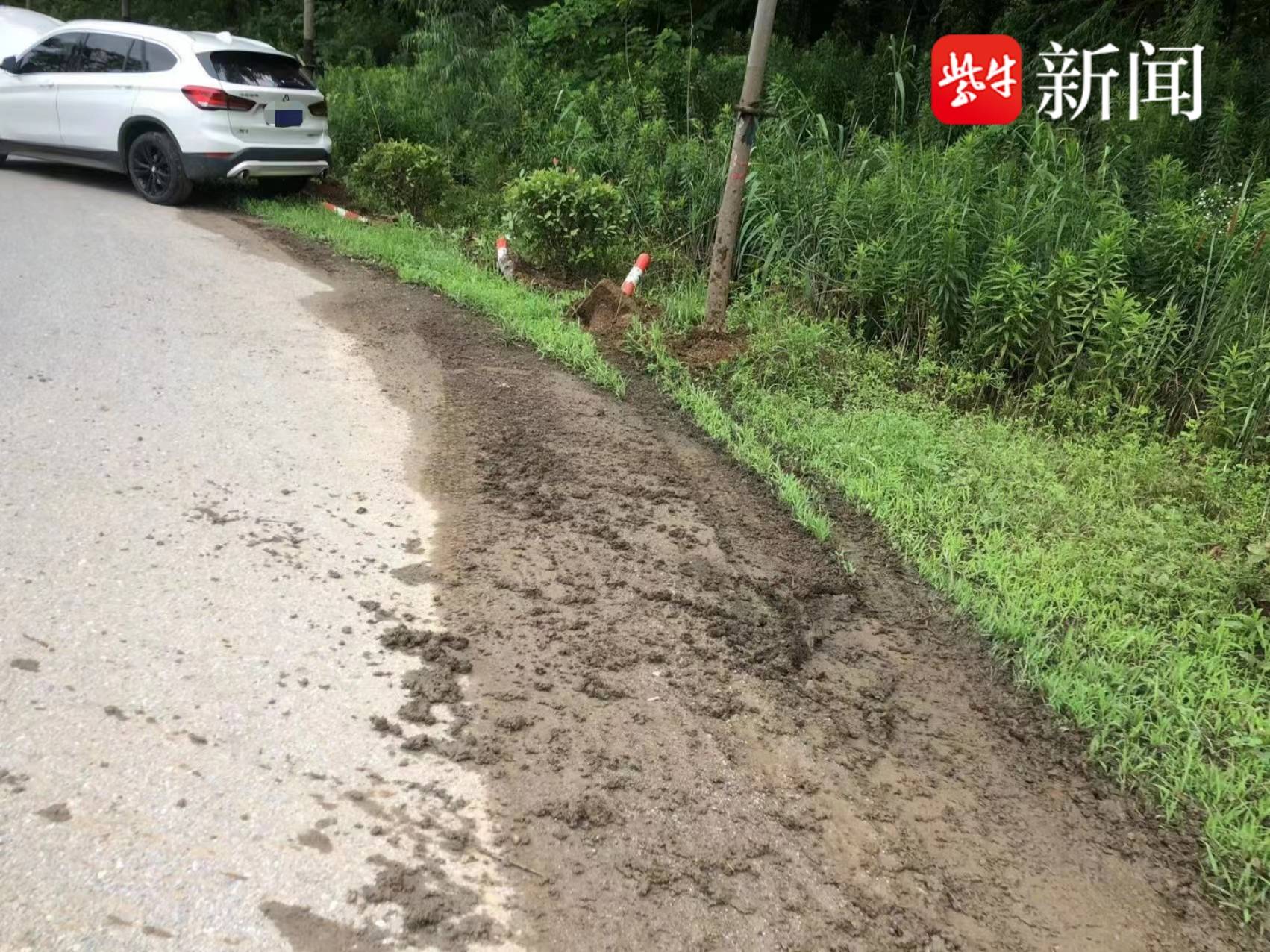 图为车辆“跑边”撞坏路边护栏