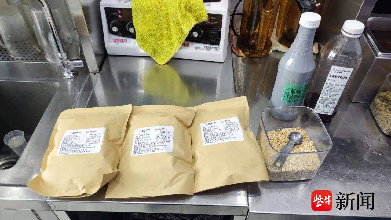在太仓市璜泾镇布布奶茶店检查中时,执法人员在店内奶茶配制区域的桌面上发现有一盒用了一半的“花生碎”。执法人员核对店内剩余的大包装“花生碎”时发现,生产日期为2022年11月12日,保质期6个月,已经过期。该店经营者承认这些过期的“花生碎”是用于制作该店的招牌奶茶。