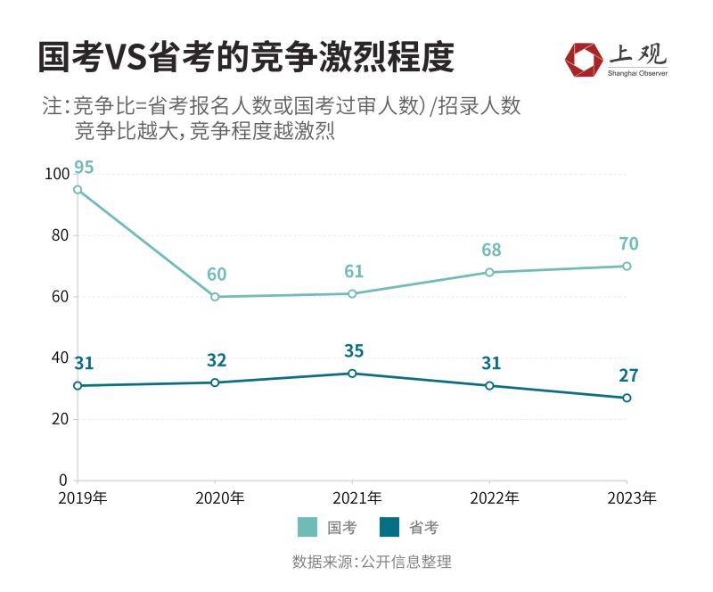国考在2023年的竞争比为70:1,也就是平均70人要角逐一个职位,平均录取率仅为1.4%。省考在2023年的竞争比为27:1,平均录取率3.7%,高于国考。