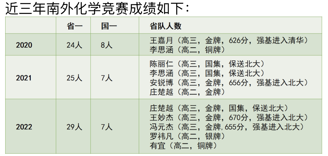 记者了解到,此前的2023年第36届中国化学奥林匹克竞赛上,高三年级的庄楚越、王妙杰、冯元杰获得国家金牌,其中庄楚越同学进入国家集训队,直接保送北京大学,王妙杰、冯元杰获得强基破格资格,在高考中以高分顺利考入北京大学。
