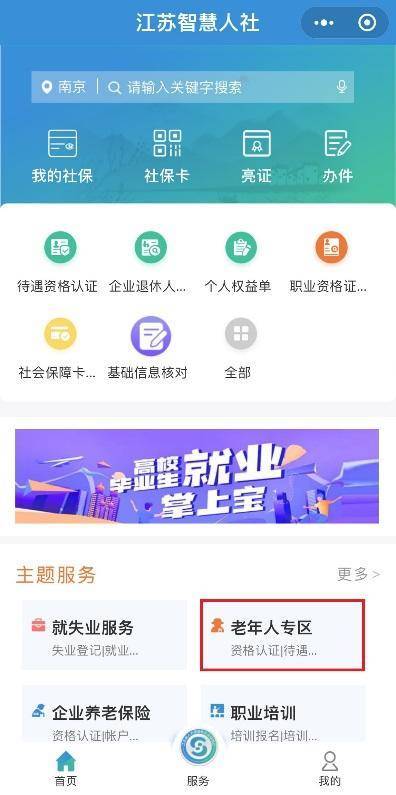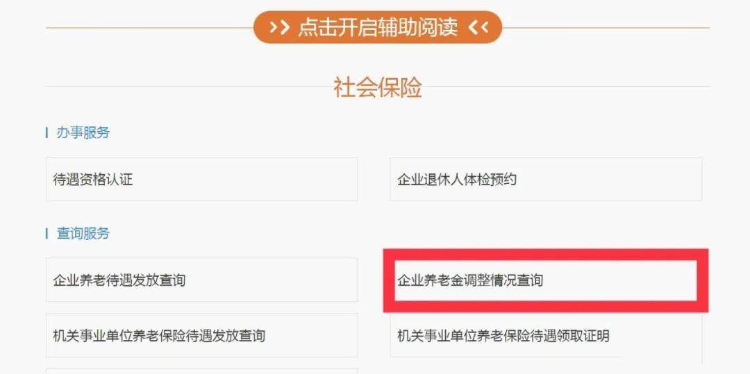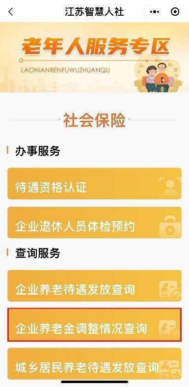 登录“江苏智慧人社”手机APP或微信小程序,选择首页“老年人专区”,点击“企业养老金调整情况查询”。