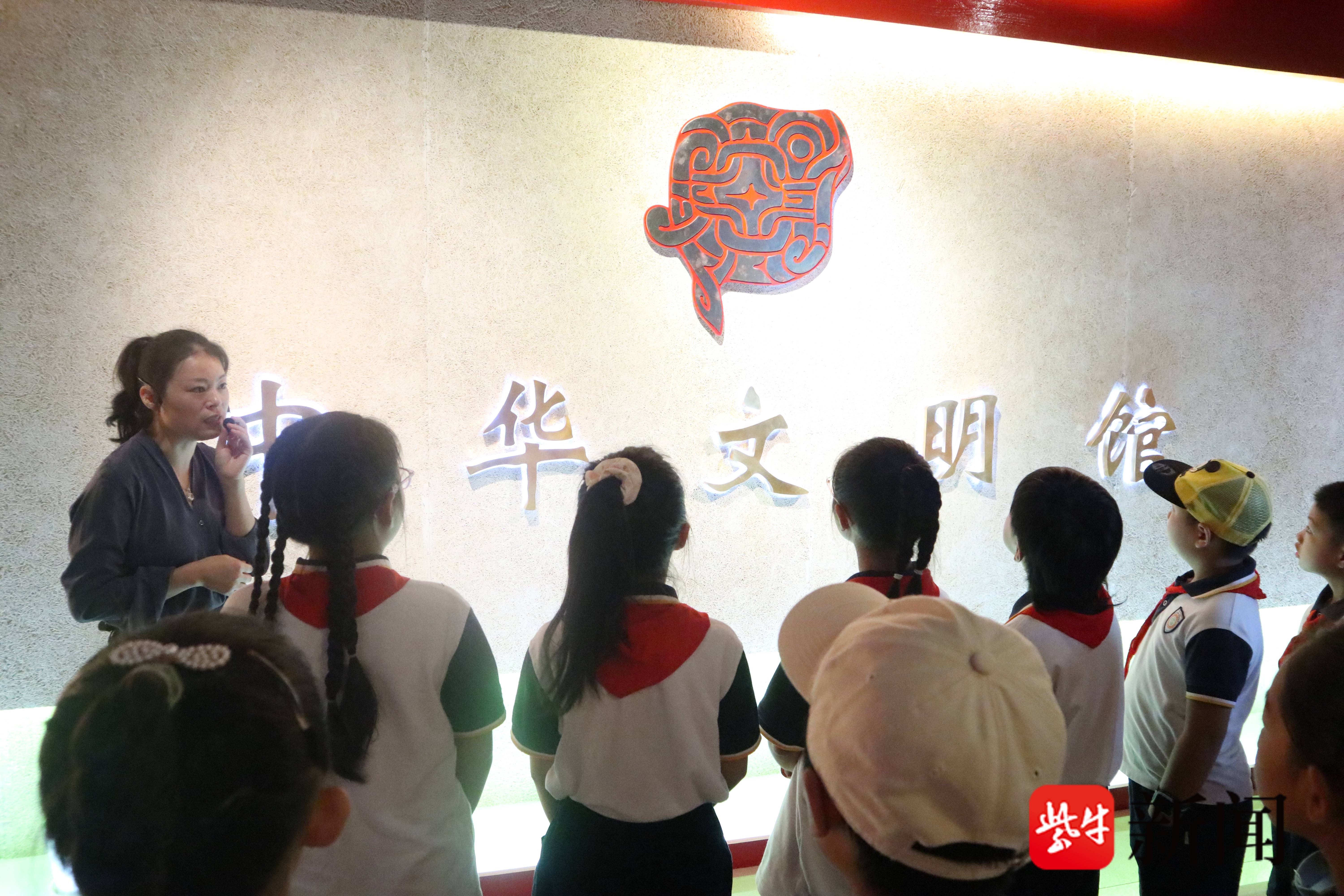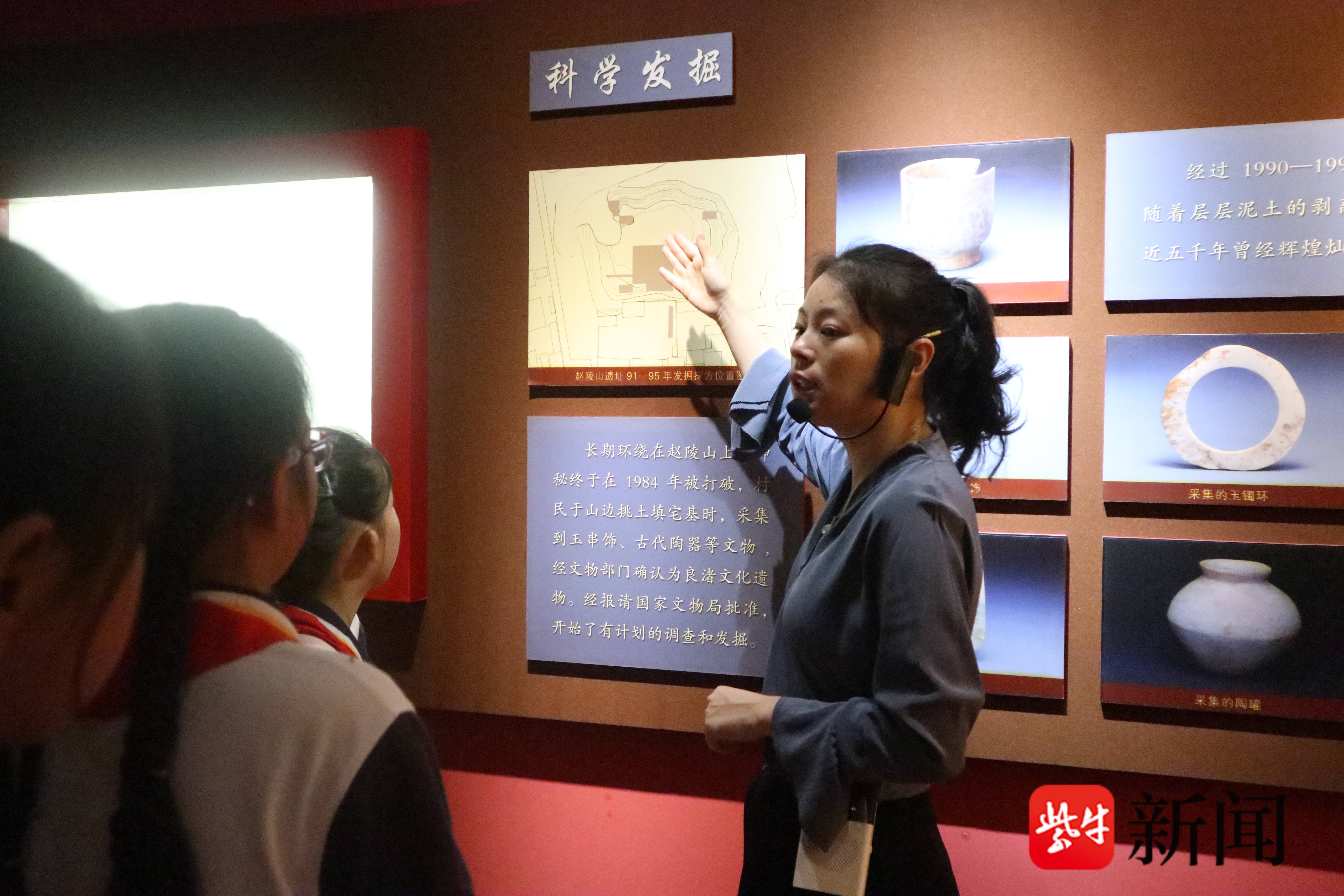 “赵陵山良渚文化遗址在1992年被评为全国十大考古成果之一,这是江苏省首次获得该荣誉。”在美研中心中华文明馆,采风团紧跟在讲解员,一边听着讲解,一边瞪大了眼睛欣赏着文物。讲解员说:“良渚文化留下了许多宝贵遗产,该文化的‘一只脚’已经迈入文明的门槛!”人兽鸟组合体玉顶饰、玉琮、彩绘陶贯耳壶……讲解员向小团员们介绍起了古国遗珍,还表示玉龙形玦是古时候的耳环呢!