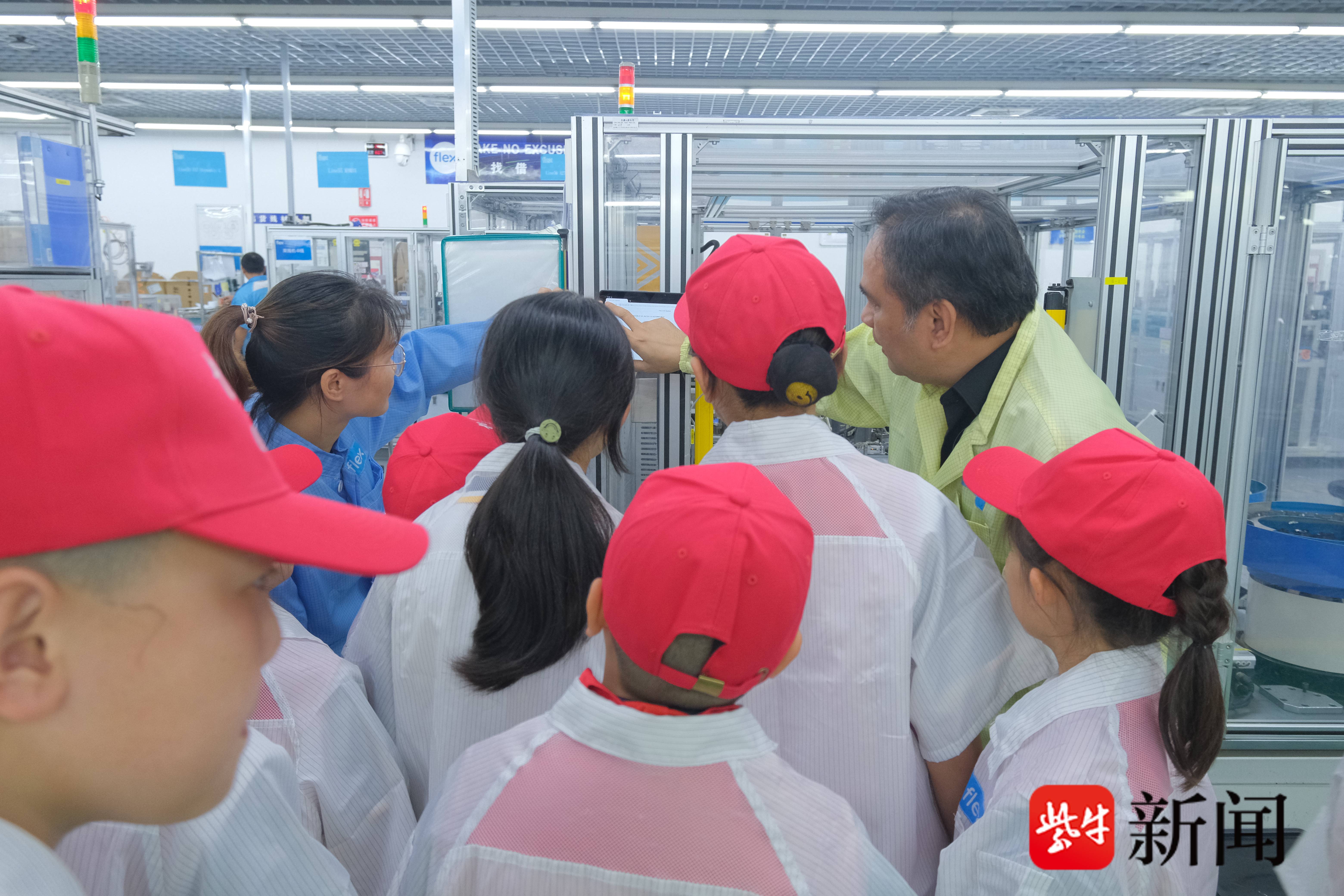 “欢迎大家来参观生产车间!”在汽车零配件生产公司,讲解员的话音刚落,“采风团二队”的小团员们一片欢呼雀跃,急不可耐地换上了防静电无尘服,排好了队前往车间一探究竟。“这个是车顶灯!”“这边还有门把手!”正当小团员们忙于探索汽车配件时,该公司经理也前来迎接小团员们的到来,带领大家参观了车间、仓库和办公室。公司经理全程用英语向大家进行介绍,小团员们也毫不胆怯,直接用英语回答交流。