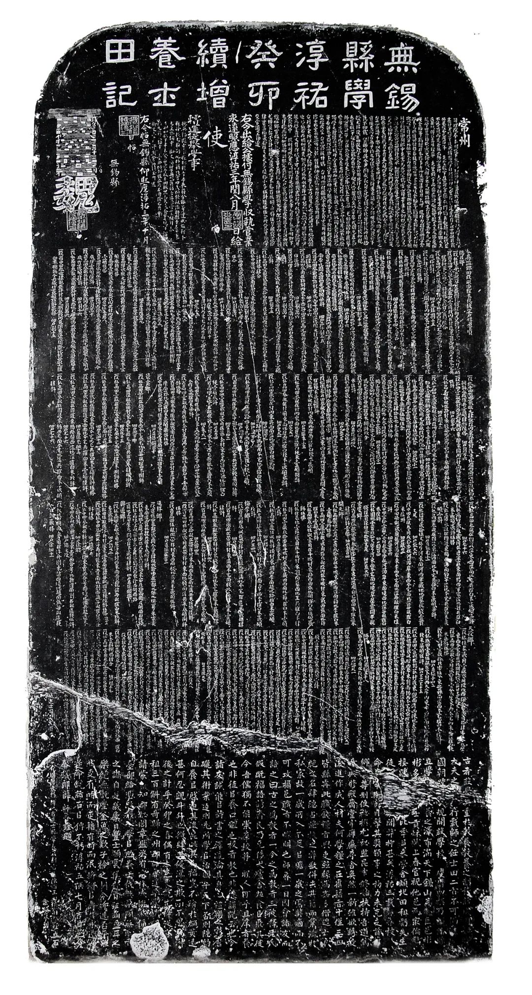 这四通碑刻中,“南宋无锡县学淳祐癸卯续增养士田记碑”碑文,叙述经常州府和两浙西路提举学事司批准将没收本县贪吏尤梓田产拨交无锡县学的经过,刊刻有当时官府的全部文卷,且逐段开列没收土地的地点、四至、面积、租额和佃户姓名,相当于一部宋代的鱼鳞图册,为研究宋代地税制度提供了宝贵的具体资料,是学界重要的经济碑刻。