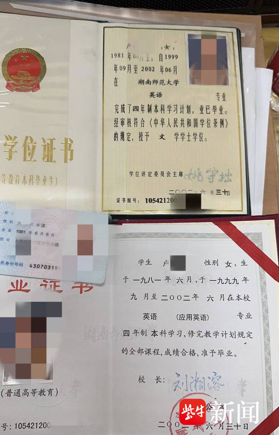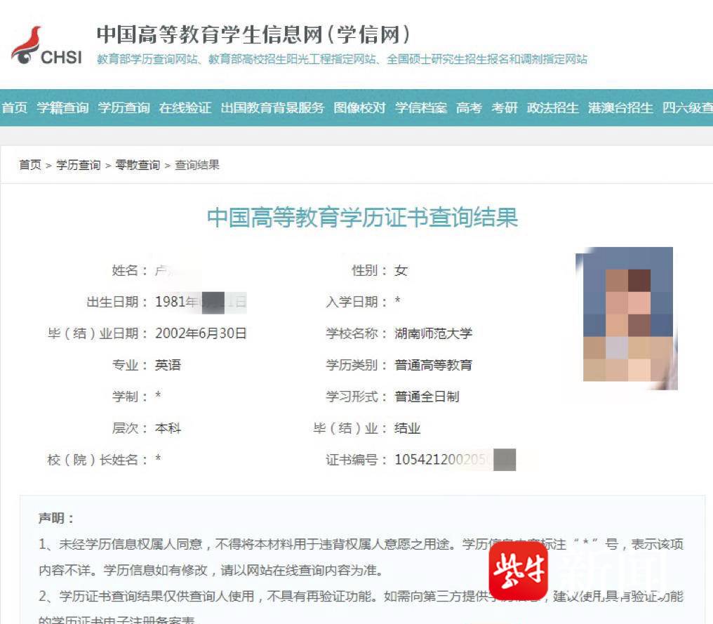 卢女士解释道,自己当年通过高考考上了湖南师范大学的应用英语专业,是2002年的本科毕业生,“我毕业的时候没有任何挂科,成绩都是合格的,学校也给我颁发了毕业证书和学位证书,但那时候还没有学信网这个平台。”