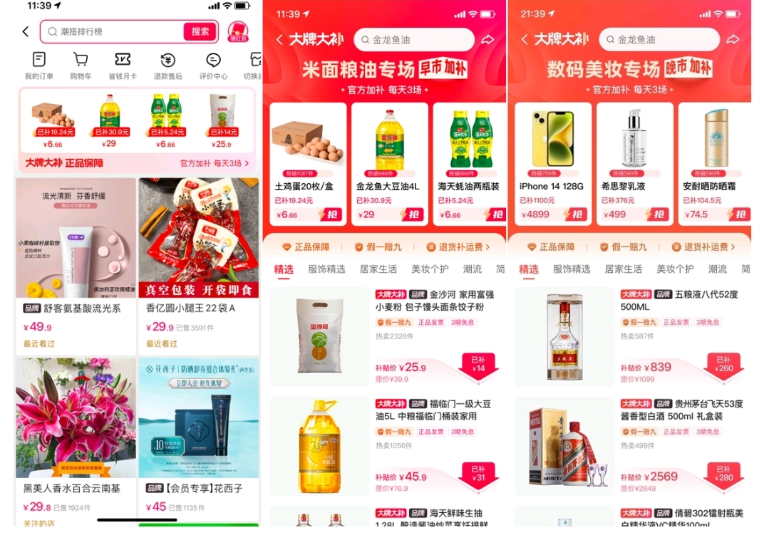 与此同时,大牌大补频道每日还会上线“早午晚市”专场,即在早六点、中午十二点、晚上六点分别上线加补专场,早市推出米面粮油专场(6:00-12:00),午市推出牛奶抽纸专场(12:00-18:00)