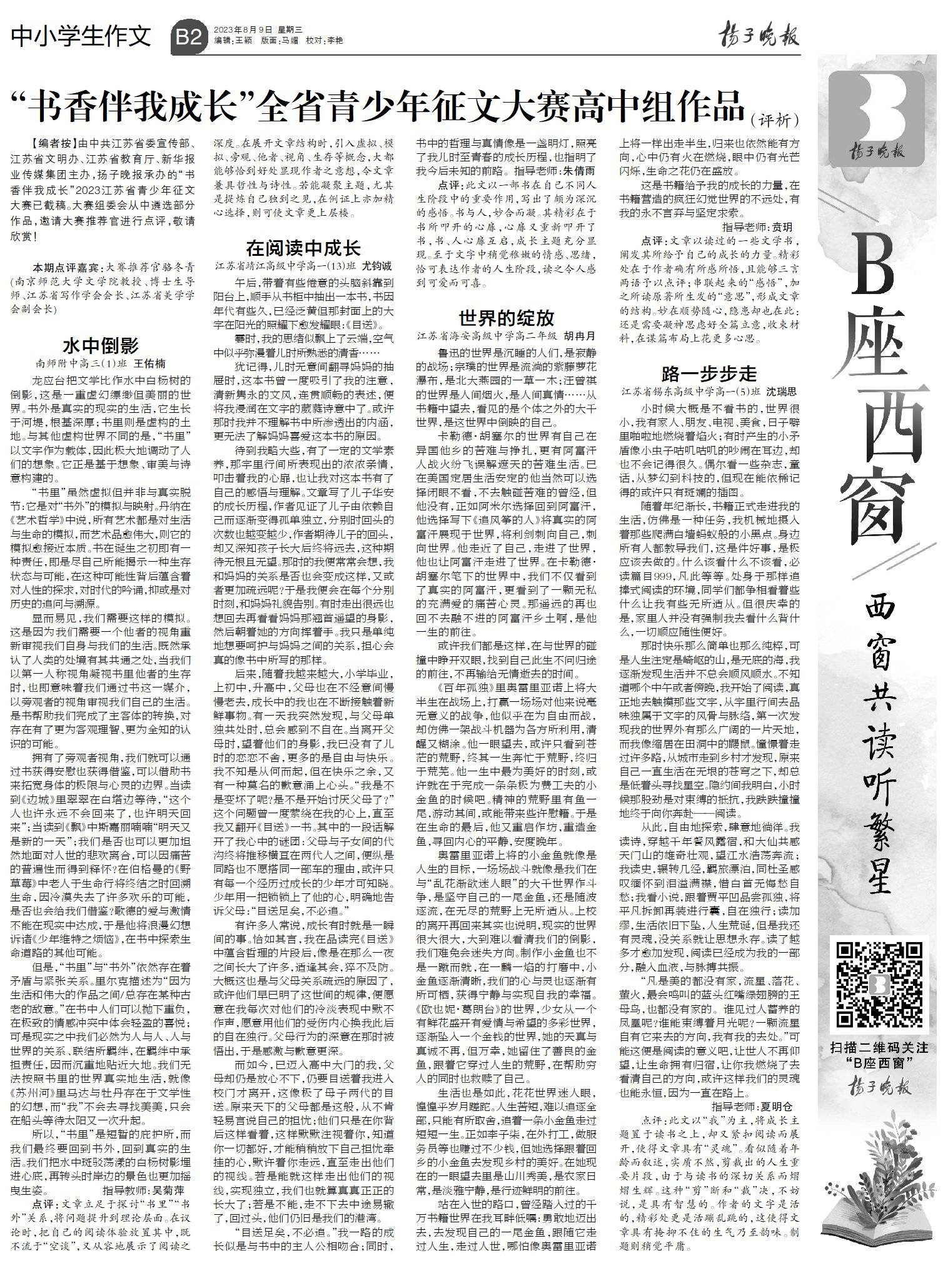 点评:此文以“我”为主,将成长主题置于读书之上,却又紧扣阅读而展开,使得文章具有“灵魂”。看似随着年龄而叙述,实质不然,剪裁出的人生重要片段,由于与读书的深切关系而熠熠生辉。这种“剪”断和“裁”决,不妨说,是具有智慧的。作者的文字是活的,精彩处更是活蹦乱跳的,这使得文章具有掩抑不住的生气乃至韵味。制题则稍觉平庸。